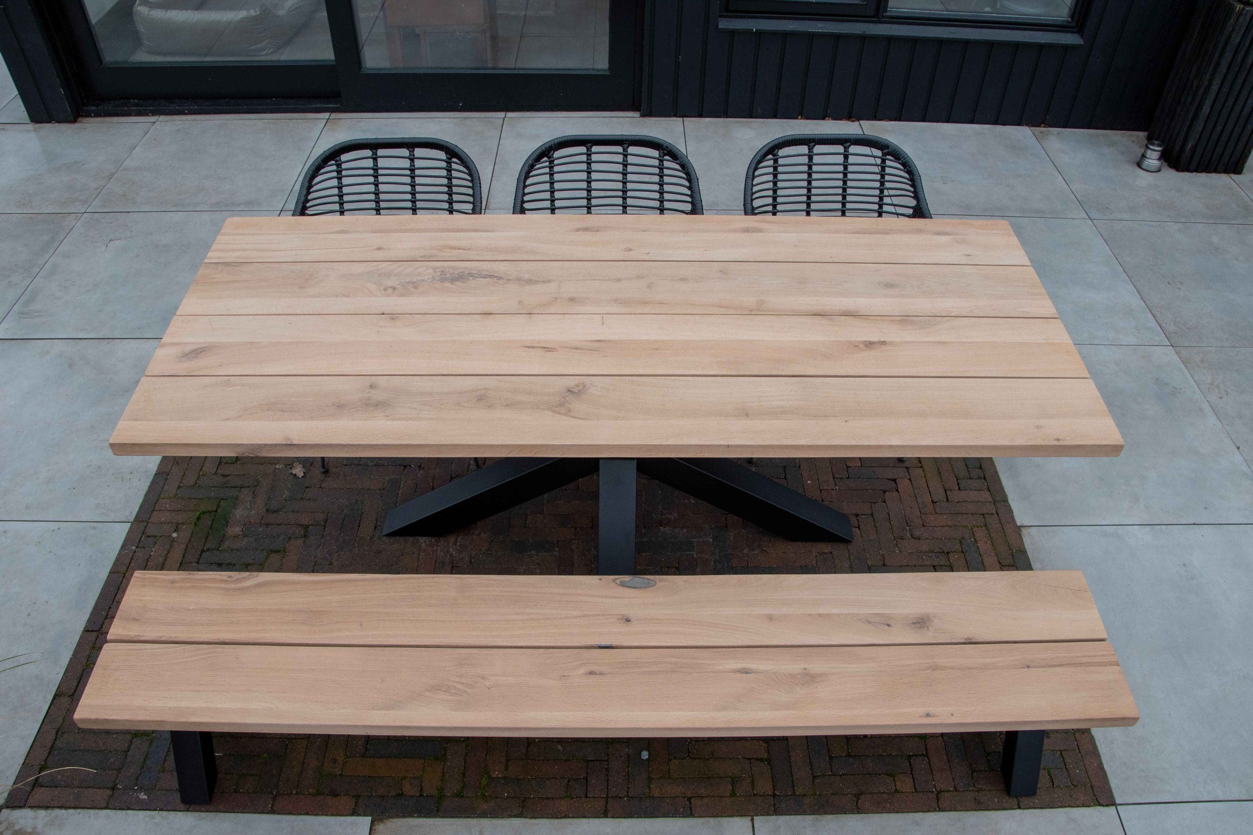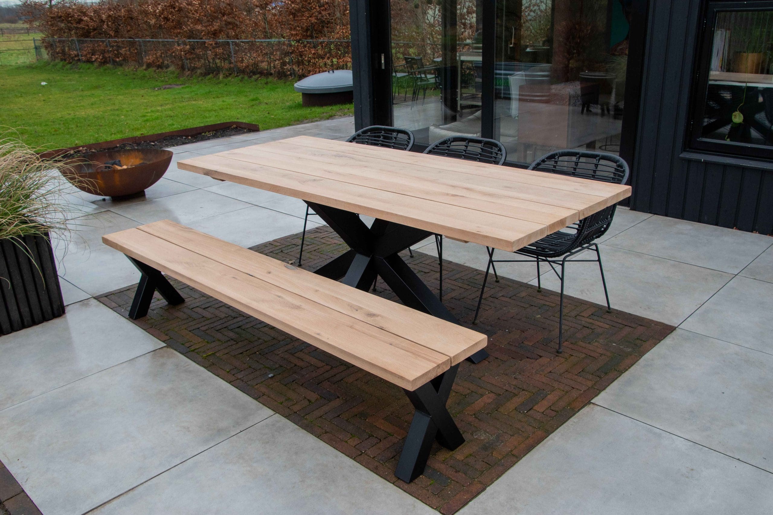 Prachtige eiken tuintafel samenstellen met stalen onderstellen. Het tafelblad is gemaakt van eikenhout afkomstig uit Frankrijk. Doordat wij het gehele proces zelf in de hand hebben garanderen wij de hoogste kwaliteit voor de beste prijs. Het hout wordt vakkundig gedroogd en bewerkt, wij zorgen er altijd voor dat al het hout met een FSC keuring wordt afgegeven. De Nano bescherming zorgt ervoor dat wanneer er scheurtjes ontstaan in het hout het niet gaat rotten en hierdoor doorscheuren. In combinatie met de kieren tussen de delen en het zorgvuldig afdekken met een beschermhoes bij het niet gebruiken kan de tafel zo jaren mee! De tafelbladen zijn +- 42mm dik massief! De hoogte van de grond af gemeten tot aan bovenkant tafelblad is +-76,5cm, hoogte vanaf de grond tot aan onderkant blad is +- 72,5cm. De stalen poten worden compleet gepoedercoat, hierdoor krast het niet als u er met de voet of stoel tegen aan komt. Ook gaat het hierdoor niet roesten, ideaal in gebruik dus!