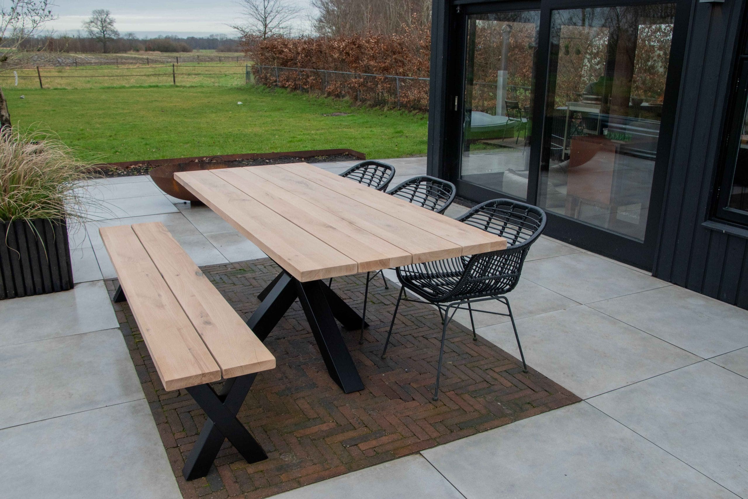 Let wel op eikenhout werkt buiten altijd, het hout zal altijd vergrijzen en er zullen haarlijnen ontstaan. Wij raden altijd een bij het niet gebruiken ervan de tafel volledig af te dekken met een beschermhoes. De beschermhoes is direct mee te bestellen bij de tafel, hierdoor zult u de levensduur flink verlengen!