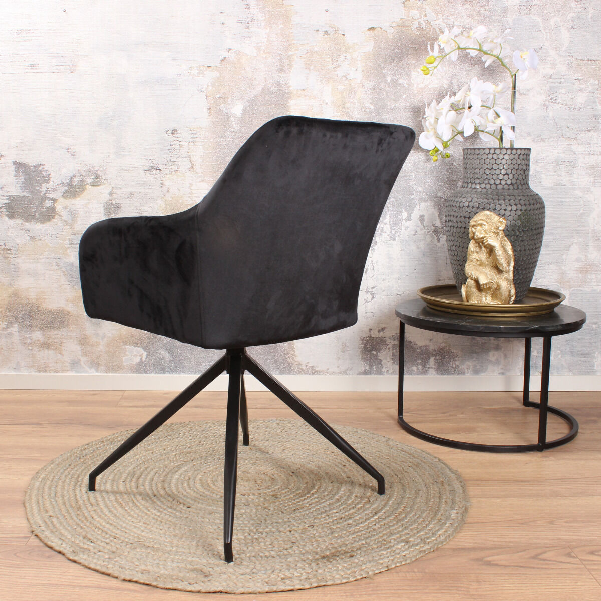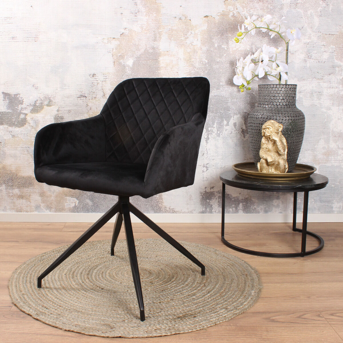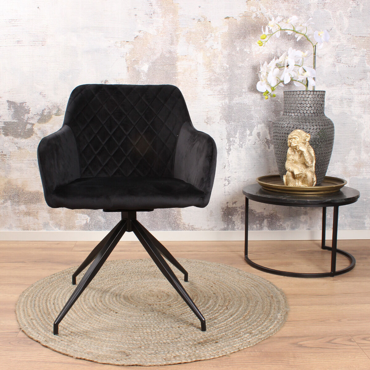 Amy armstoel velvet zwart heeft een luxueuze uitstraling en is uiterst comfortabel. Daarnaast is deze stoel ook nog 180 graden draaibaar. Dit zorgt ervoor dat er niet met stoelen geschoven hoeft te worden. Je stapt makkelijk in en uit de stoel. Daarnaast draait de stoel zelf weer terug naar zijn oorspronkelijke positie. Ideaal! De zitting is bekleed met zacht velvet voor een fijn zitcomfort. De rugleuning is voorzien van een geruit stiksel. Armstoel Amy is verkrijgbaar in vier hippe kleuren: champagne, zwart, groen en goud. De stoel staat op een stevige vierpoot van zwart gepoedercoat staal. Doordat eetkamer armstoel Amy voorzien is van armleuningen is het mogelijk uren na te tafelen met je favoriete tafelgasten.