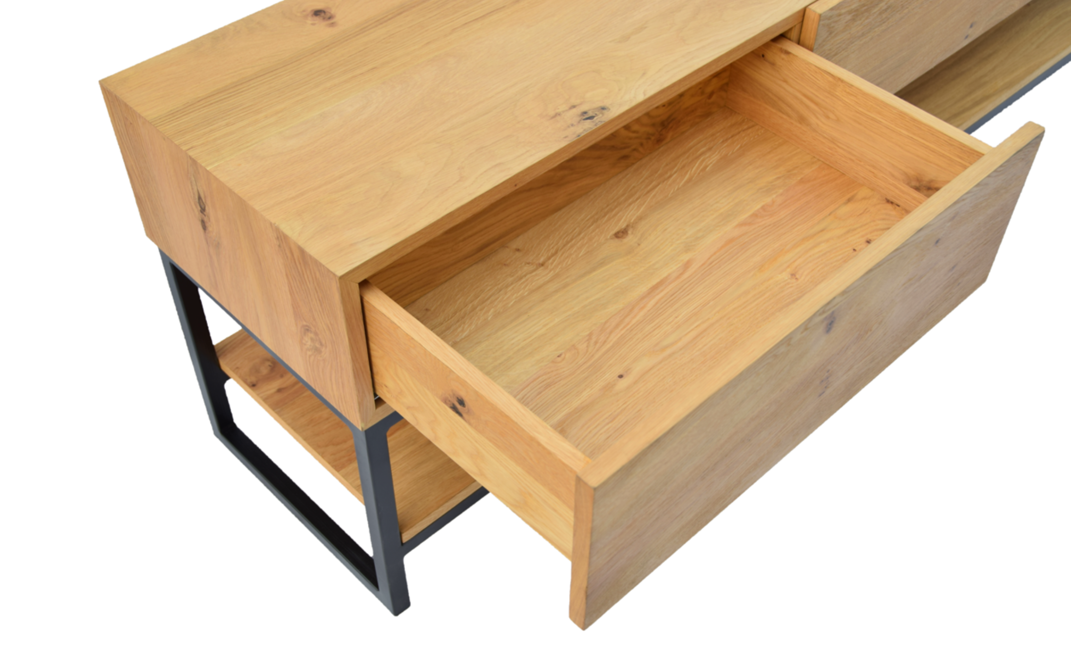 Het prachtige europeese eikenhout geeft het meubel een natuurlijke en warme uitstraling, terwijl de zwarte accenten van het staal een modern tintje toevoegen aan het ontwerp.