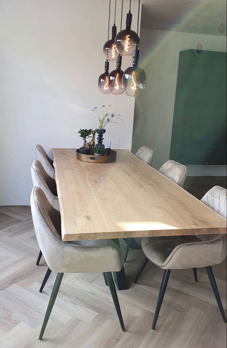 De tafelbladen hebben een vochtpercentage van 8 – 12%, waardoor de kans op scheuren en kromtrekken nihil is. Wij maken in ieder tafelblad binnenwerks speciale pin en gat verbindingen, in combinatie met het massieve stevige terug gedroogde eikenhout. Uiteraard blijft eiken een natuurproduct en kunnen er (kleine) werkingen in het hout ontstaan. Om uw blad in een optimale staat te houden, is een vochtpercentage binnenshuis tussen de 45% en 65% wenselijk.