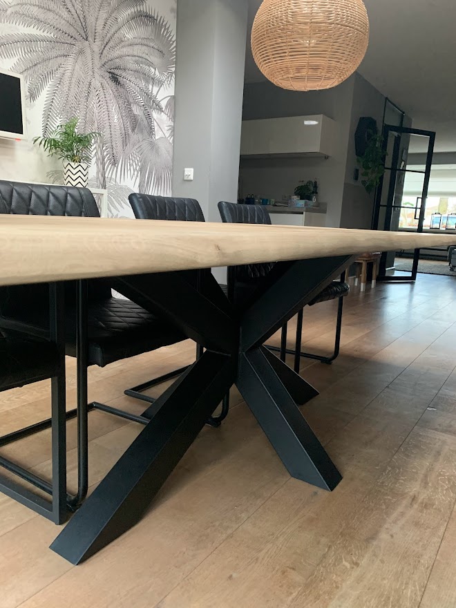 Bij de stalen 3D spin poot hebt u eigenlijk een zwevend effect, dit zorgt ervoor dat u rondom de tafel goed kunt zitten zonder dat de tafelpoot in de weg zit voor de stoelen. Uw volledige gekozen lengte van het tafelblad is dan ook direct de ruimte die u hebt voor de stoelen.