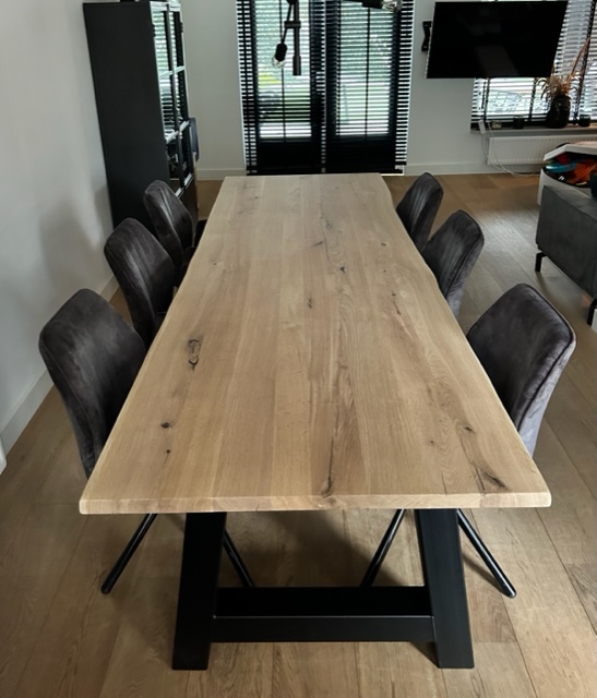 Prachtige eiken boomstamtafel met stalen A poot. Het eiken tafelblad is gemaakt van eikenhout afkomstig uit Frankrijk, doordat wij het gehele proces zelf in de hand hebben garanderen wij de hoogste kwaliteit voor de beste prijs. Het hout wordt vakkundig gedroogd en bewerkt, wij zorgen er altijd voor dat al het hout met een FSC keuring wordt afgegeven. Het tafelblad wordt altijd netjes glad afgewerkt en is gemakkelijk met een vochtige doek schoon te maken. De tafelbladen zijn +- 4cm dik volledig massief! De hoogte van de grond af gemeten tot aan bovenkant tafelblad is +-76,5cm en +-72,5cm onderkant blad. De stalen poten worden compleet gepoedercoat, hierdoor krast het niet als u er met de voet of stoel tegen aan komt. Ook gaat het hierdoor niet roesten, ideaal in gebruik dus!
