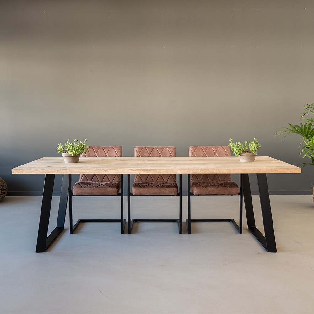 Prachtige eiken boomstamtafel met stalen Denn poot. Het eiken tafelblad is gemaakt van eikenhout afkomstig uit Frankrijk, doordat wij het gehele proces zelf in de hand hebben garanderen wij de hoogste kwaliteit voor de beste prijs. Het hout wordt vakkundig gedroogd en bewerkt, wij zorgen er altijd voor dat al het hout met een FSC keuring wordt afgegeven. Het tafelblad wordt altijd netjes glad afgewerkt en is gemakkelijk met een vochtige doek schoon te maken. De tafelbladen zijn +- 4cm dik volledig massief! De hoogte van de grond af gemeten tot aan bovenkant tafelblad is 76,5cm. De stalen poten worden compleet gepoedercoat, hierdoor krast het niet als u er met de voet of stoel tegen aan komt. Ook gaat het hierdoor niet roesten, ideaal in gebruik dus!