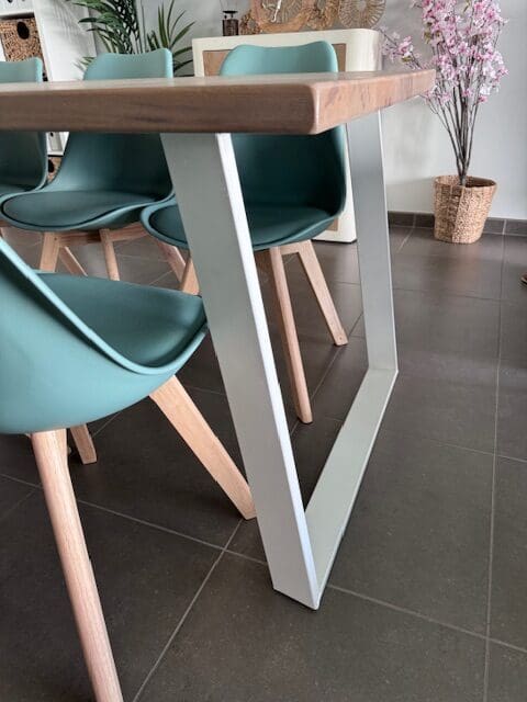 De tafelpoten worden los van het tafelblad geleverd, er zitten zelf tappende schroeven bij die niet hoeven voorgeboord te worden. Zo kunt u zelf ter plekke de gewenste tussenruimte bepalen. De maximale tussenruimte is te berekenen als volgt: Lengte tafel – 25cm = maximale tussenruimte.