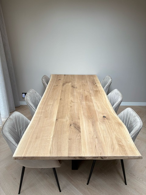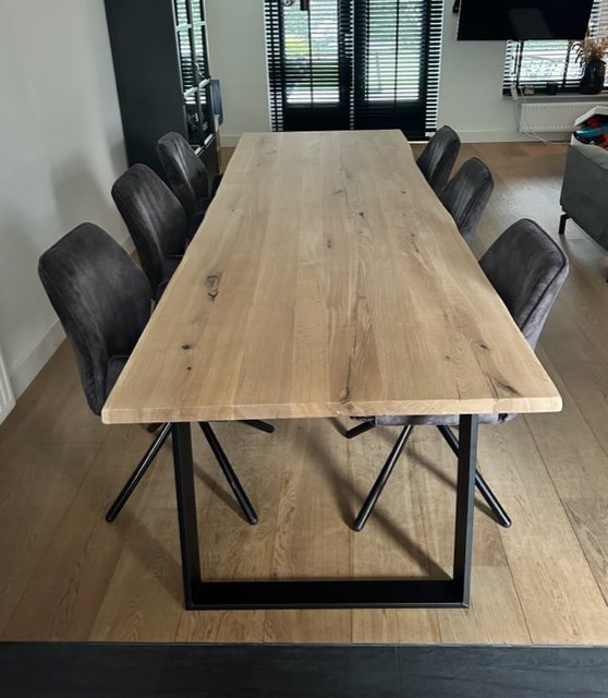 De tafelbladen hebben een vochtpercentage van 8 – 12%, waardoor de kans op scheuren en kromtrekken nihil is. Wij maken in ieder tafelblad binnenwerks speciale pin en gat verbindingen, in combinatie met het massieve stevige terug gedroogde eikenhout zal het tafelblad nooit gaan doorhangen, zelfs op 300cm lengte niet met beide poten aan het uiteinde. Uiteraard blijft eiken een natuurproduct en kunnen er (kleine) werkingen in het hout ontstaan. Om uw blad in een optimale staat te houden, is een vochtpercentage binnenshuis tussen de 45% en 65% wenselijk.
