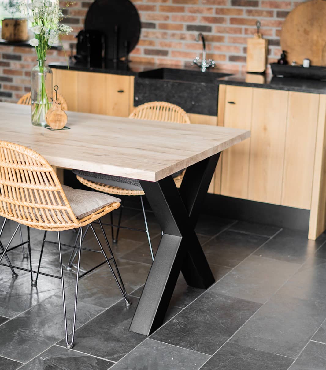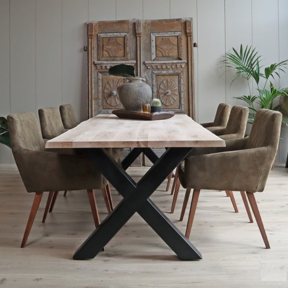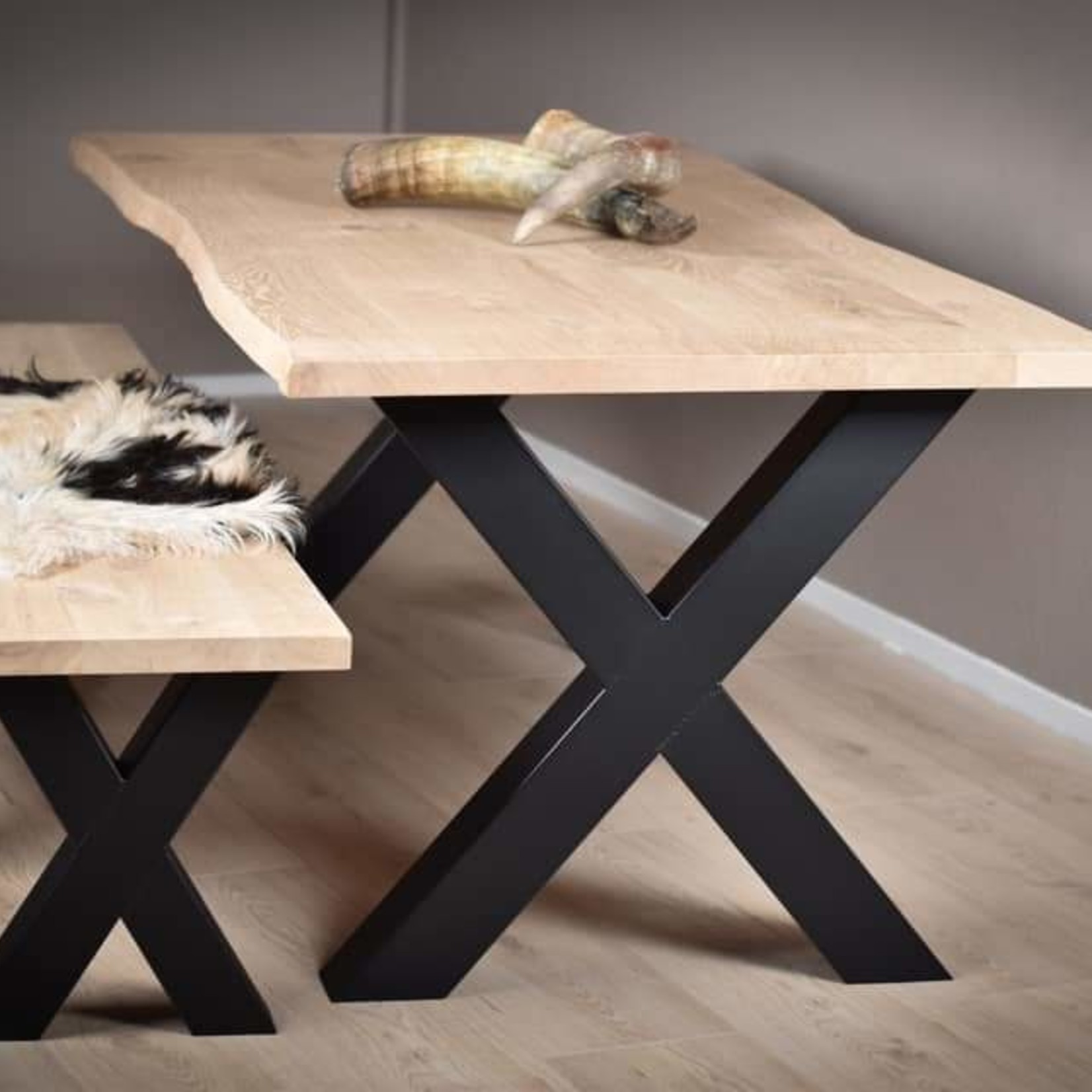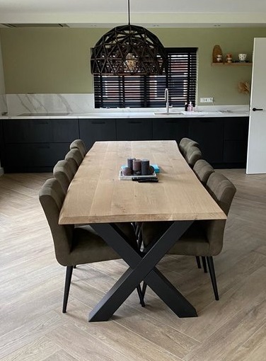 Prachtige eiken boomstam eettafel met stalen kruispoot. Het eiken tafelblad is gemaakt van eikenhout afkomstig uit Frankrijk, doordat wij het gehele proces zelf in de hand hebben garanderen wij de hoogste kwaliteit voor de beste prijs. Het hout wordt vakkundig gedroogd en bewerkt, wij zorgen er altijd voor dat al het hout met een FSC keuring wordt afgegeven. Het tafelblad wordt altijd netjes glad afgewerkt en is gemakkelijk met een vochtige doek schoon te maken. De tafelbladen zijn +- 4cm dik volledig massief! De hoogte van de grond af gemeten tot aan bovenkant tafelblad is 76,5cm. De stalen poten worden compleet gepoedercoat, hierdoor krast het niet als u er met de voet of stoel tegen aan komt. Ook gaat het hierdoor niet roesten, ideaal in gebruik dus! Ook een eiken eettafel met kruispoot aanschaffen? Bestellen gaat makkelijk via onze website. Daarnaast leveren wij ook snel de bestelde tafel, zodat u snel kunt gaan genieten!