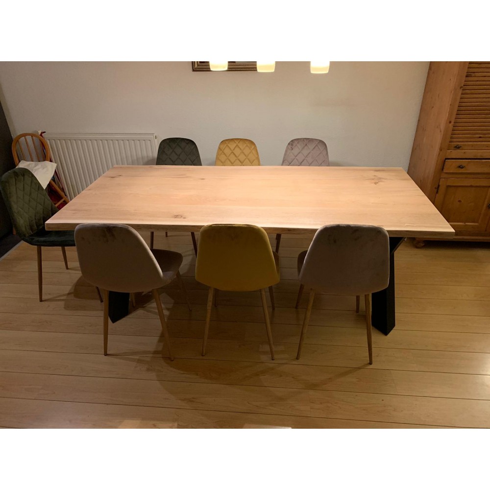 Prachtige eiken boomstamtafel met stalen X diamand poot. Het eiken tafelblad is gemaakt van eikenhout afkomstig uit Frankrijk, doordat wij het gehele proces zelf in de hand hebben garanderen wij de hoogste kwaliteit voor de beste prijs. Het hout wordt vakkundig gedroogd en bewerkt, wij zorgen er altijd voor dat al het hout met een FSC keuring wordt afgegeven. Het tafelblad wordt altijd netjes glad afgewerkt en is gemakkelijk met een vochtige doek schoon te maken. De tafelbladen zijn +- 4cm dik volledig massief! De hoogte van de grond af gemeten tot aan bovenkant tafelblad is 76,5cm. De stalen poten worden compleet gepoedercoat, hierdoor krast het niet als u er met de voet of stoel tegen aan komt. Ook gaat het hierdoor niet roesten, ideaal in gebruik dus!