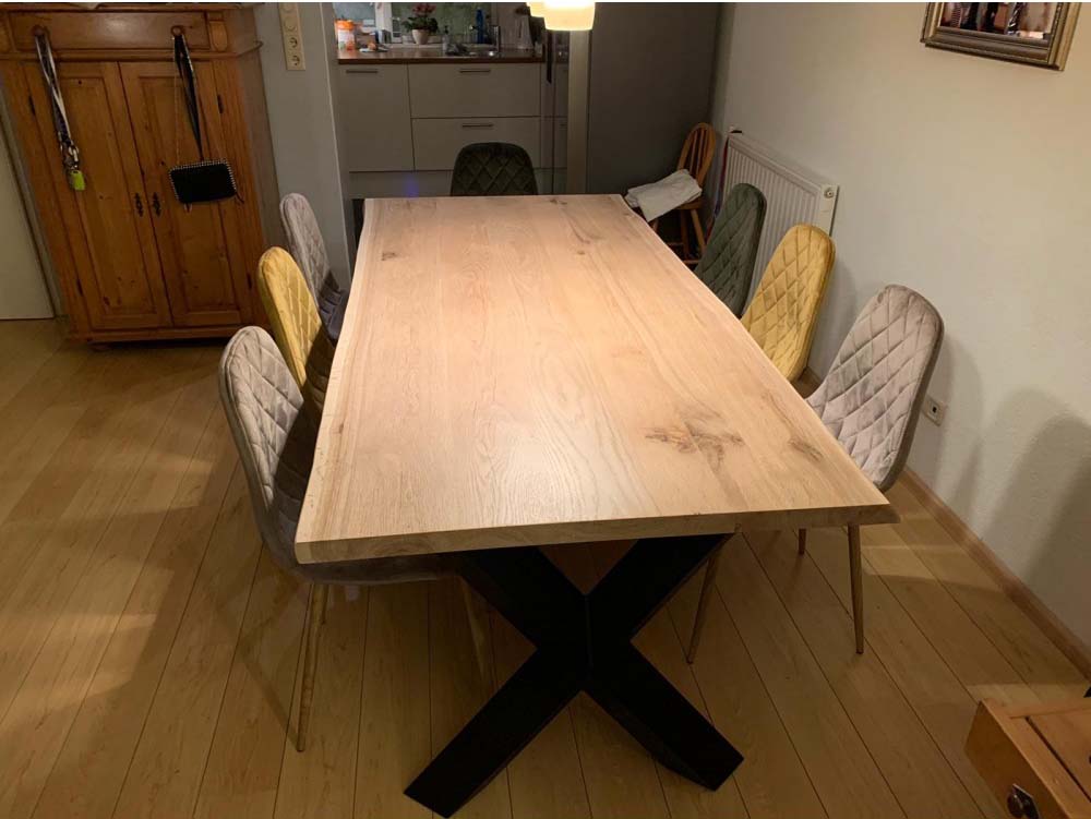 De tafelbladen hebben een vochtpercentage van 8 – 12%, waardoor de kans op scheuren en kromtrekken nihil is. Wij maken in ieder tafelblad binnenwerks speciale pin en gat verbindingen, in combinatie met het massieve stevige terug gedroogde eikenhout zal het tafelblad nooit gaan doorhangen, zelfs op 300cm lengte niet met beide poten aan het uiteinde. Uiteraard blijft eiken een natuurproduct en kunnen er (kleine) werkingen in het hout ontstaan. Om uw blad in een optimale staat te houden, is een vochtpercentage binnenshuis tussen de 45% en 65% wenselijk.