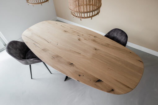 Prachtige eiken Deens ovaal tafel met stalen Starline poot. Het eiken tafelblad is gemaakt van eikenhout afkomstig uit Frankrijk, doordat wij het gehele proces zelf in de hand hebben garanderen wij de hoogste kwaliteit voor de beste prijs. Het hout wordt vakkundig gedroogd en bewerkt, wij zorgen er altijd voor dat al het hout met een FSC keuring wordt afgegeven. Het tafelblad wordt altijd netjes glad afgewerkt en is gemakkelijk met een vochtige doek schoon te maken. De tafelbladen zijn +- 4cm dik volledig massief! De hoogte van de grond af gemeten tot aan bovenkant tafelblad is 76,5cm. De stalen poten worden compleet gepoedercoat, hierdoor krast het niet als u er met de voet of stoel tegen aan komt. Ook gaat het hierdoor niet roesten, ideaal in gebruik dus!