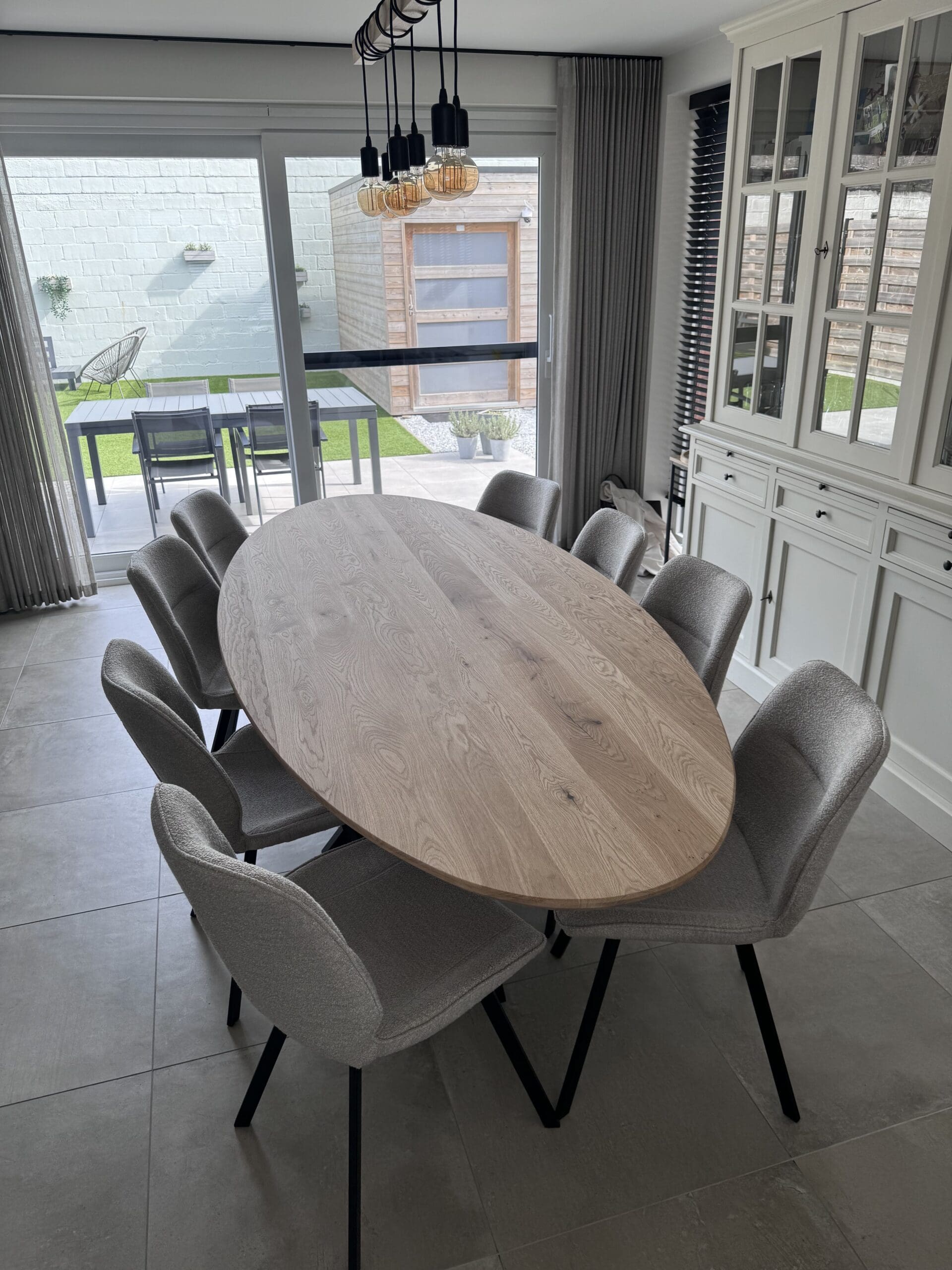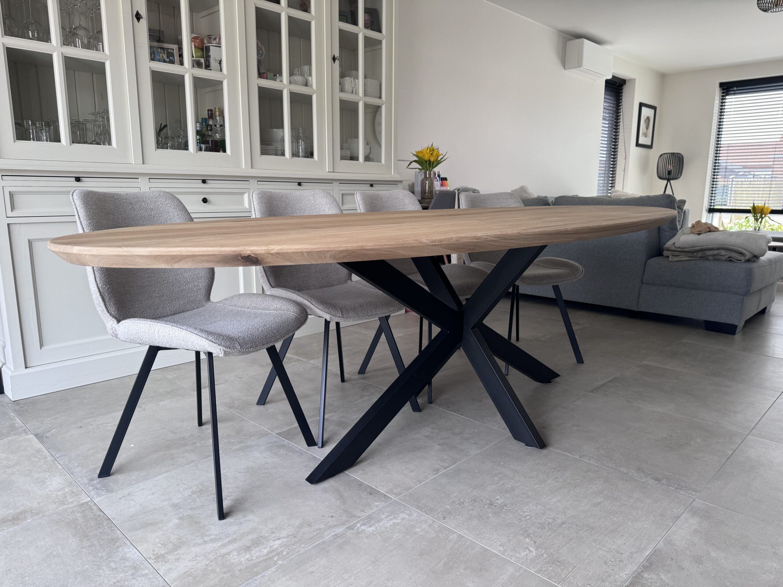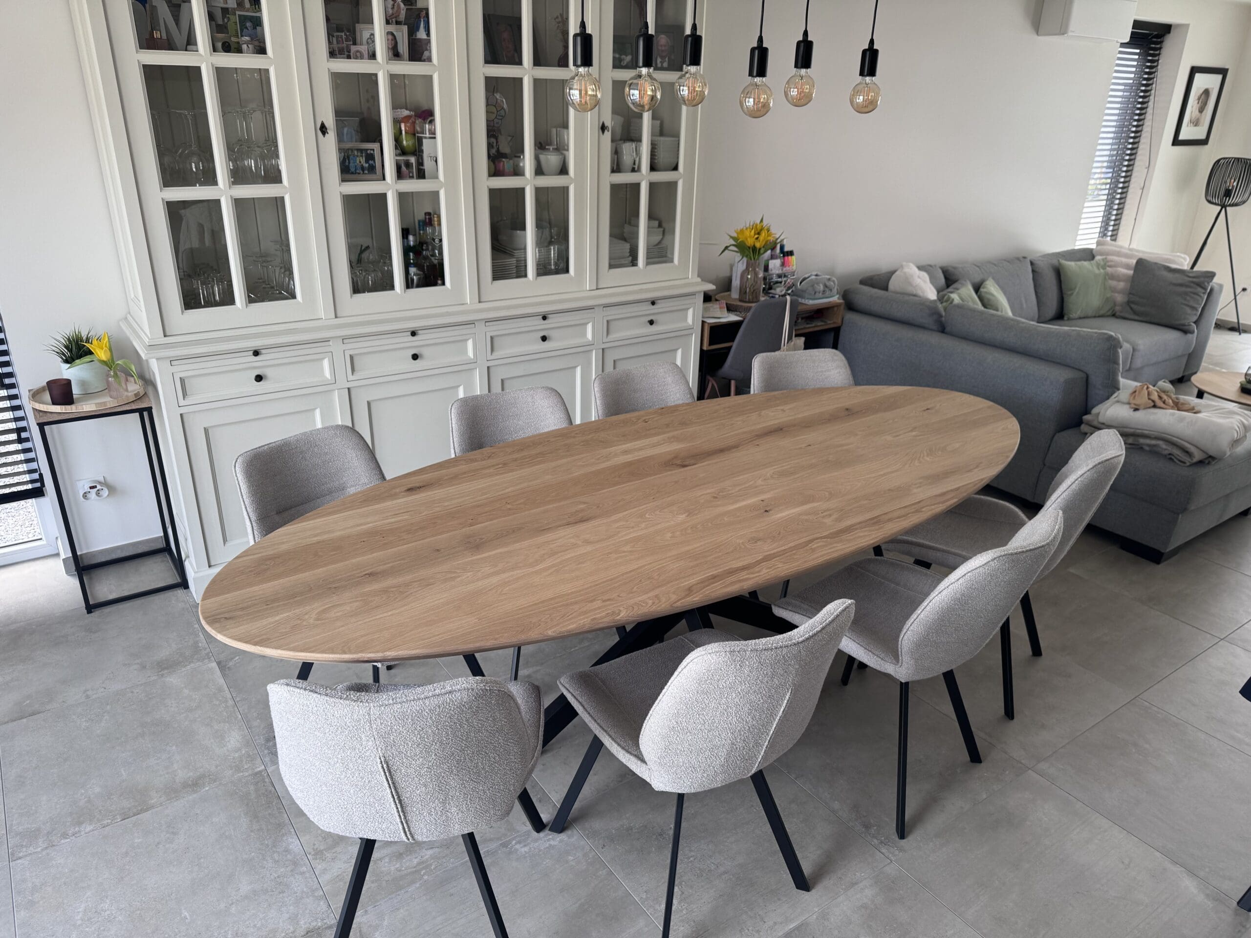 Prachtige eiken eettafel ovaal met verjongde randen en een stalen 3D spin poot. Het eiken tafelblad is gemaakt van eikenhout afkomstig uit Frankrijk, doordat wij het gehele proces zelf in de hand hebben garanderen wij de hoogste kwaliteit voor de beste prijs. Het hout wordt vakkundig gedroogd en bewerkt, wij zorgen er altijd voor dat al het hout met een FSC keuring wordt afgegeven. Het tafelblad wordt altijd netjes glad afgewerkt en is gemakkelijk met een vochtige doek schoon te maken. De tafelbladen zijn +- 4cm dik volledig massief! De hoogte van de grond af gemeten tot aan bovenkant tafelblad is 76,5cm. De stalen poten worden compleet gepoedercoat, hierdoor krast het niet als u er met de voet of stoel tegen aan komt. Ook gaat het hierdoor niet roesten, ideaal in gebruik dus!