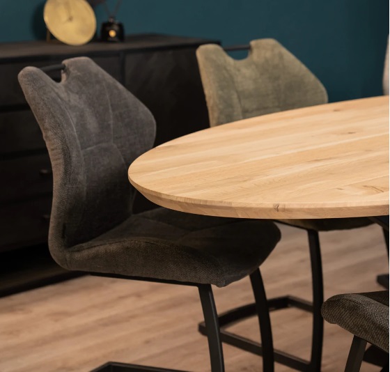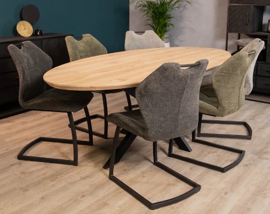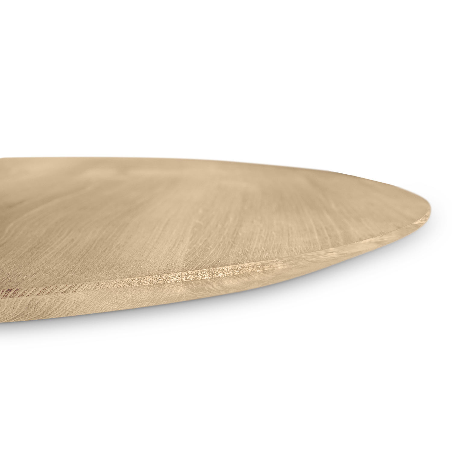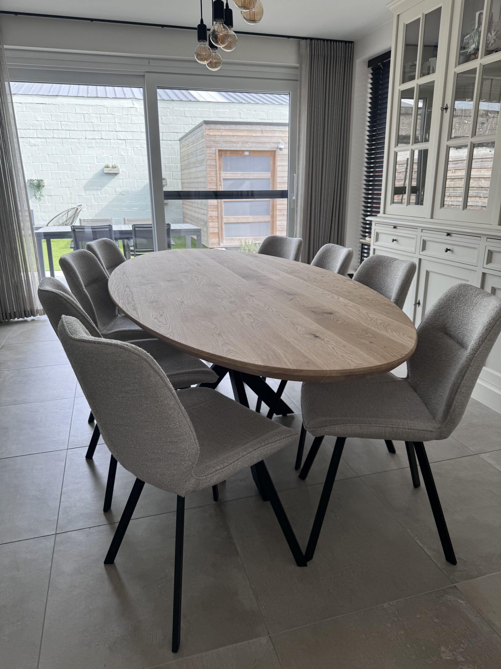 Prachtige eiken eettafel ovaal met verjongde randen en een stalen 3D spin poot. Het eiken tafelblad is gemaakt van eikenhout afkomstig uit Frankrijk, doordat wij het gehele proces zelf in de hand hebben garanderen wij de hoogste kwaliteit voor de beste prijs. Het hout wordt vakkundig gedroogd en bewerkt, wij zorgen er altijd voor dat al het hout met een FSC keuring wordt afgegeven. Het tafelblad wordt altijd netjes glad afgewerkt en is gemakkelijk met een vochtige doek schoon te maken. De tafelbladen zijn +- 4cm dik volledig massief! De hoogte van de grond af gemeten tot aan bovenkant tafelblad is 76,5cm. De stalen poten worden compleet gepoedercoat, hierdoor krast het niet als u er met de voet of stoel tegen aan komt. Ook gaat het hierdoor niet roesten, ideaal in gebruik dus!