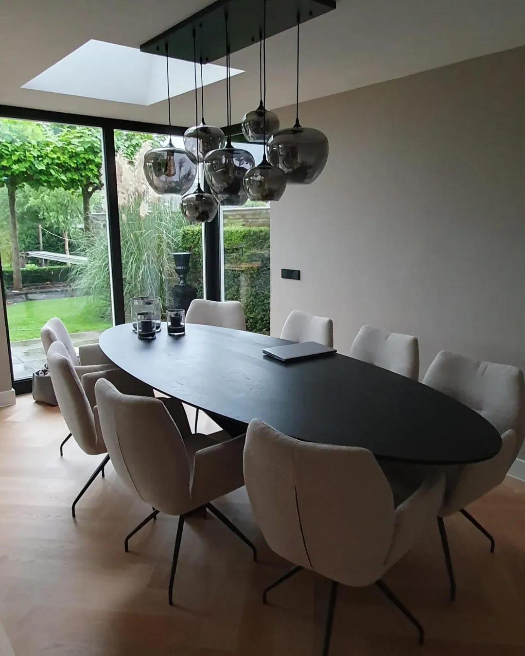 Bij de stalen 3D spin poot hebt u eigenlijk een zwevend effect, dit zorgt ervoor dat u rondom de tafel goed kunt zitten zonder dat de tafelpoot in de weg zit voor de stoelen. Uw volledige gekozen lengte van het tafelblad is dan ook direct de ruimte die u hebt voor de stoelen.