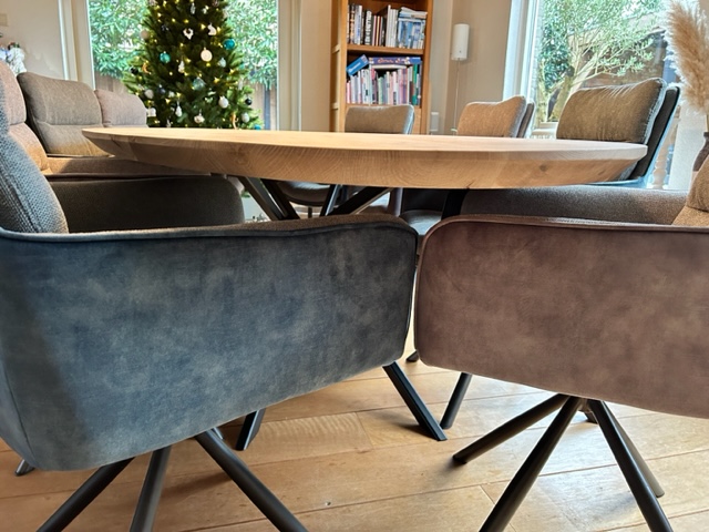 Bij de stalen Spider poot hebt u eigenlijk een zwevend effect, dit zorgt ervoor dat u rondom de tafel goed kunt zitten zonder dat de tafelpoot in de weg zit voor de stoelen. Uw volledige gekozen lengte van het tafelblad is dan ook direct de ruimte die u hebt voor de stoelen.