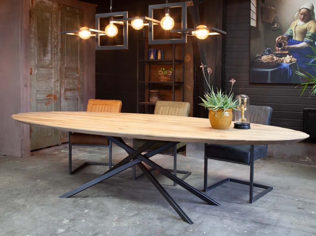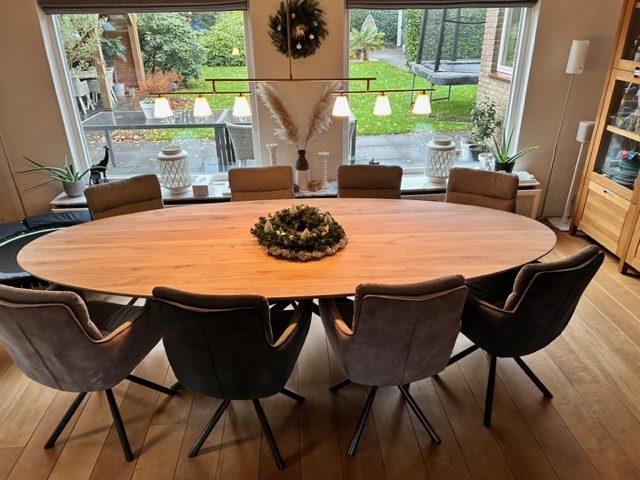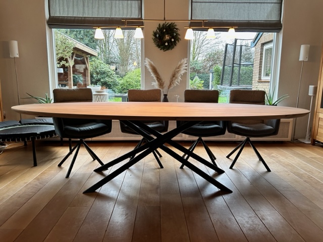 Prachtige eiken ovaal eettafel met stalen spider onderstel. Het eiken tafelblad is gemaakt van eikenhout afkomstig uit Frankrijk, doordat wij het gehele proces zelf in de hand hebben garanderen wij de hoogste kwaliteit voor de beste prijs. Het hout wordt vakkundig gedroogd en bewerkt, wij zorgen er altijd voor dat al het hout met een FSC keuring wordt afgegeven. Het tafelblad wordt altijd netjes glad afgewerkt en is gemakkelijk met een vochtige doek schoon te maken. De hoogte van de grond af gemeten tot aan bovenkant tafelblad is 77cm. De stalen poten worden compleet gepoedercoat, hierdoor krast het niet als u er met de voet of stoel tegen aan komt. Ook gaat het hierdoor niet roesten, ideaal in gebruik dus! Bestel daarom uw eiken ovaal eettafel bij Tafelplein.nl!