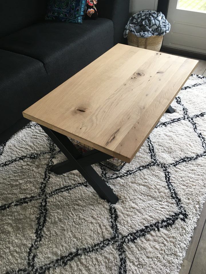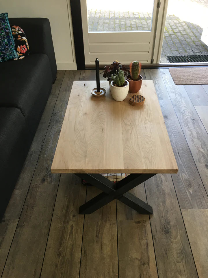 Prachtige rechte eiken salontafel met stalen X poot. Het tafelblad is gemaakt van frans eikenhout afkomstig uit Frankrijk. Doordat wij het gehele proces zelf in de hand hebben garanderen wij de hoogste kwaliteit voor de beste prijs. Het hout wordt vakkundig gedroogd en bewerkt, wij zorgen er altijd voor dat al het hout met een FSC keuring wordt afgegeven. Het tafelblad wordt altijd netjes glad afgewerkt en is gemakkelijk met een vochtige doek schoon te maken. De tafelbladen zijn 4cm dik volledig massief! De stalen poten worden compleet gepoedercoat, hierdoor krast het niet als u er met de voet of stoel tegen aan komt. Ook gaat het hierdoor niet roesten, ideaal in gebruik dus!