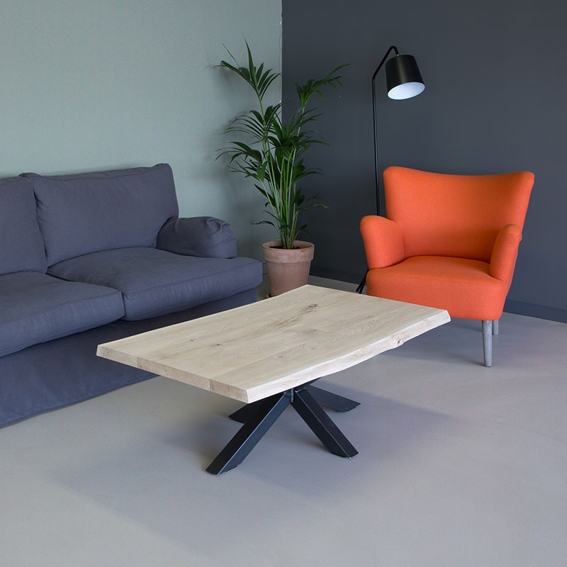 Prachtige eiken salontafel met stalen 3D spinpoot. Het tafelblad is gemaakt van frans eikenhout afkomstig uit Frankrijk. Doordat wij het gehele proces zelf in de hand hebben garanderen wij de hoogste kwaliteit voor de beste prijs. Het hout wordt vakkundig gedroogd en bewerkt, wij zorgen er altijd voor dat al het hout met een FSC keuring wordt afgegeven. Het tafelblad wordt altijd netjes glad afgewerkt en is gemakkelijk met een vochtige doek schoon te maken. De tafelbladen zijn 4cm dik volledig massief! De stalen poten worden compleet gepoedercoat, hierdoor krast het niet als u er met de voet er tegen aan komt. Ook gaat het hierdoor niet roesten, ideaal in gebruik dus!