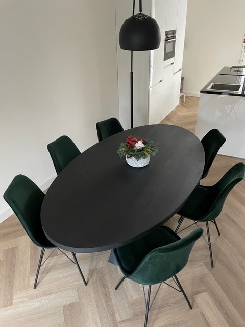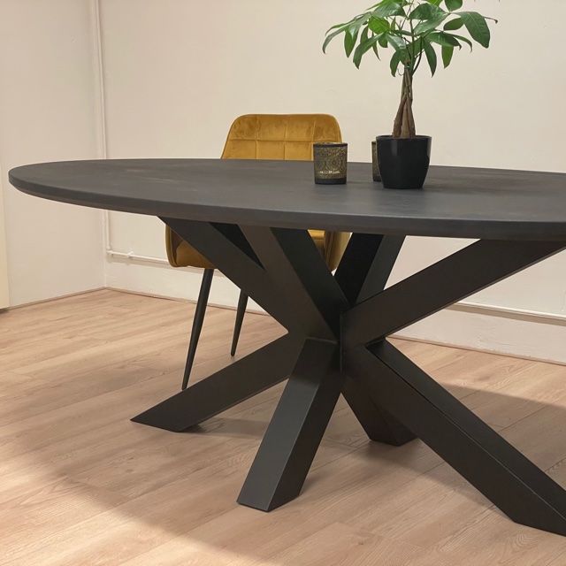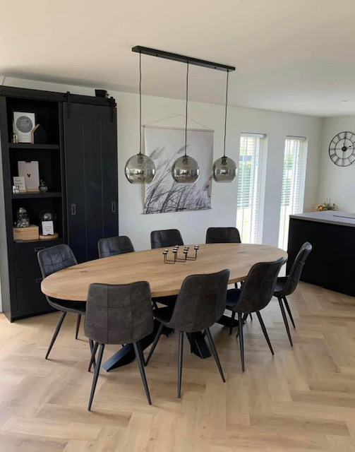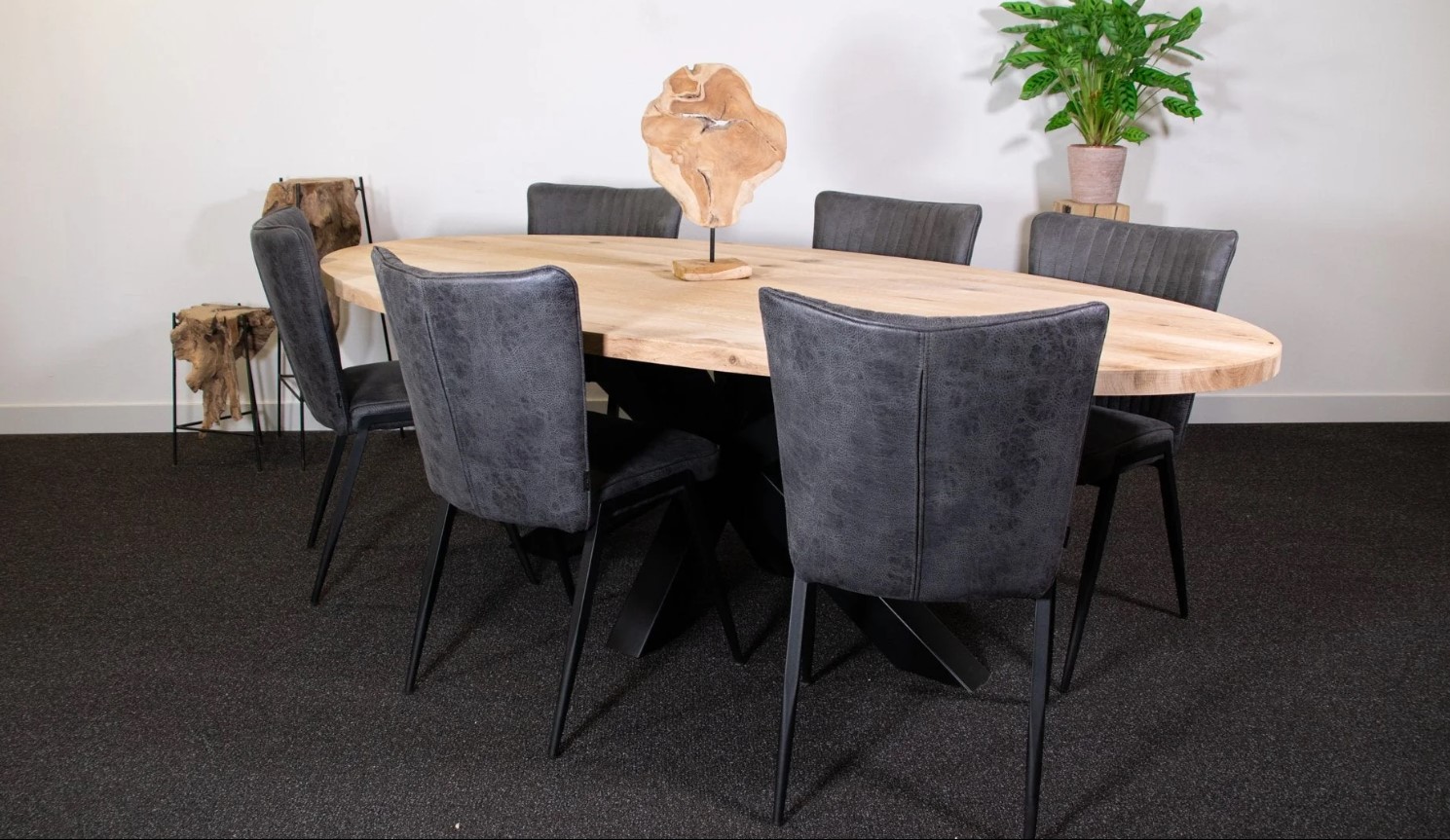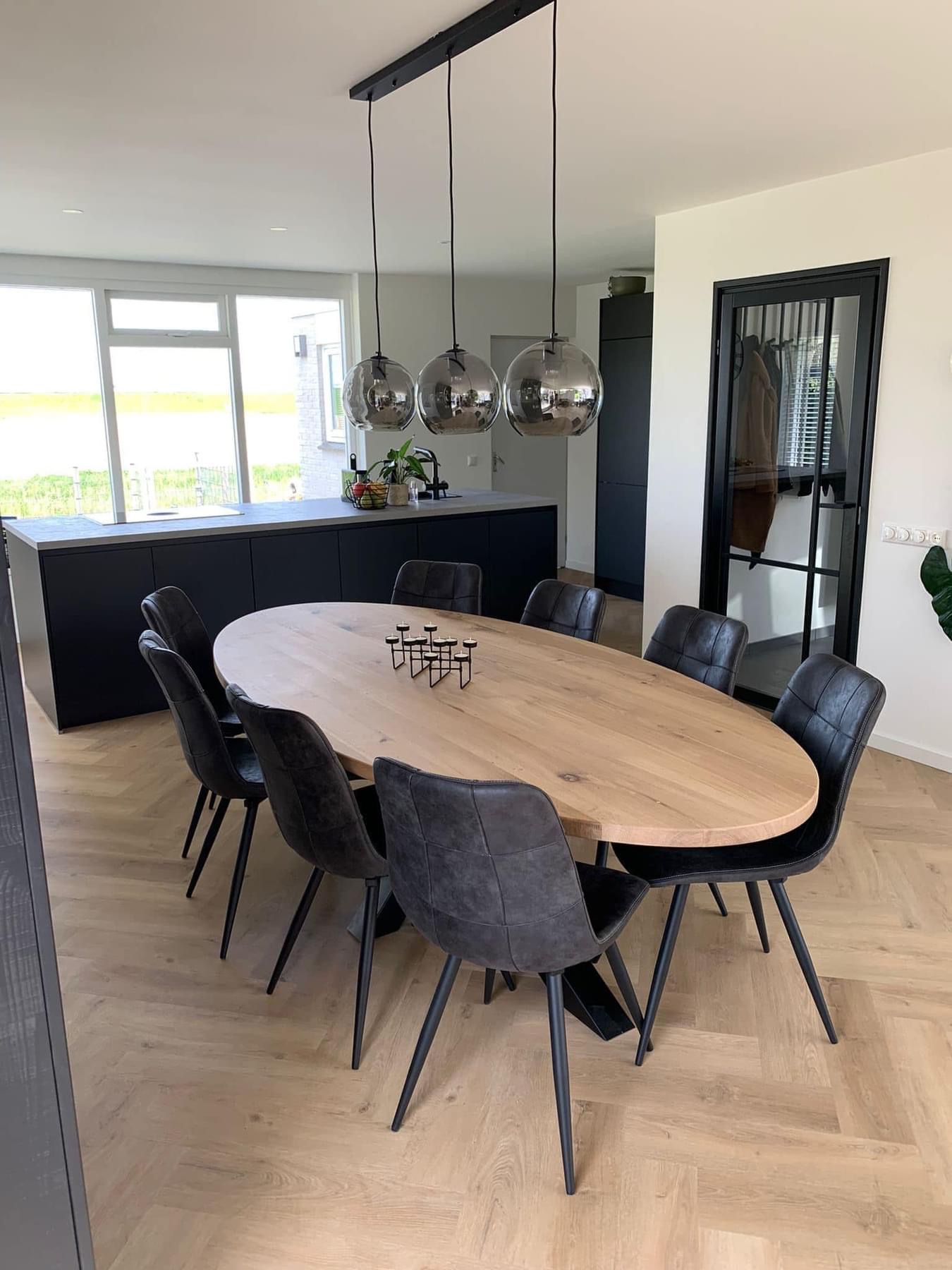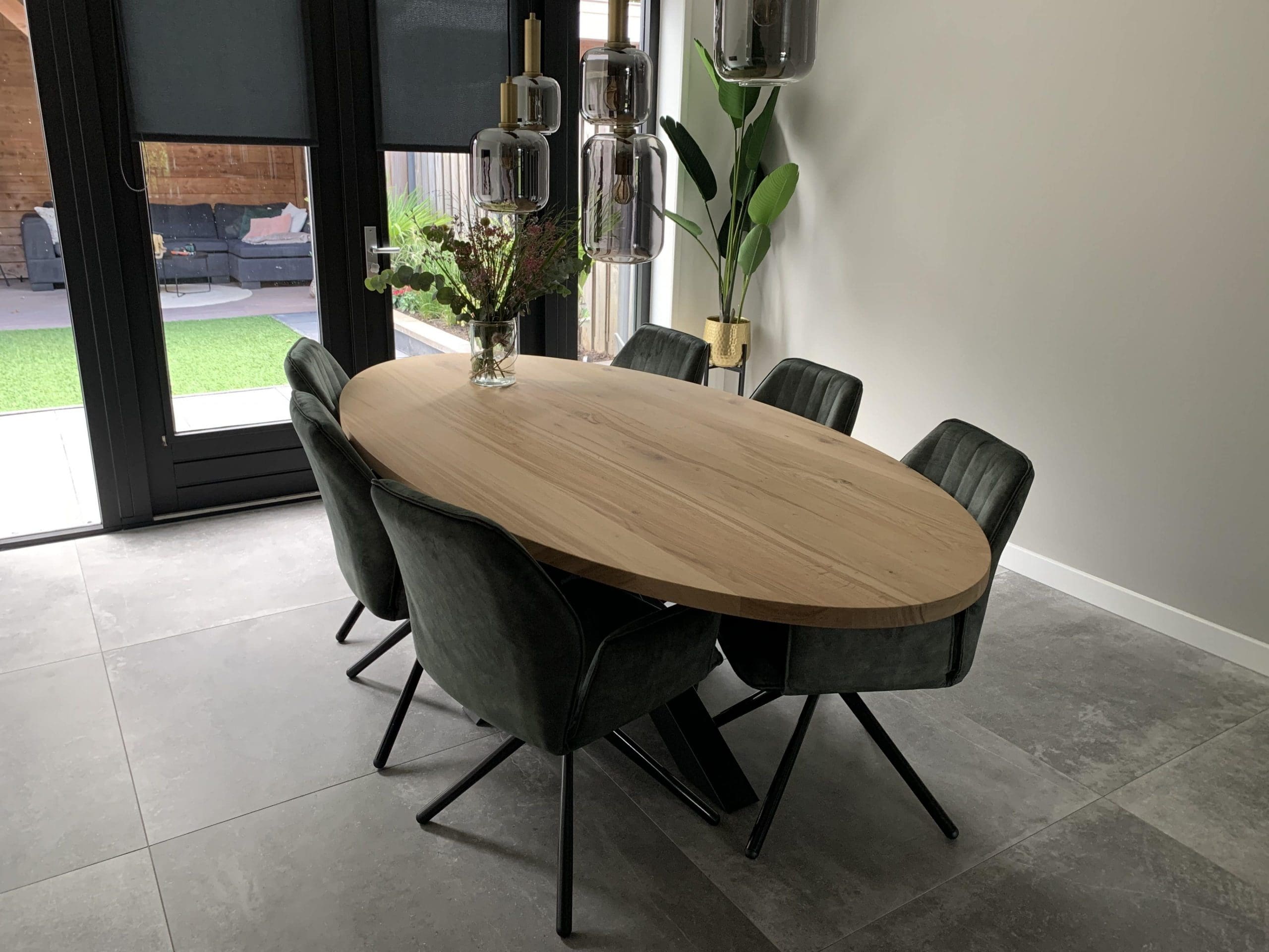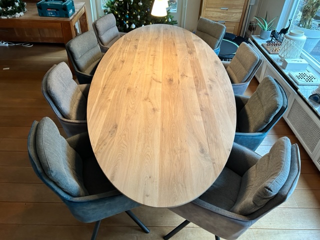Prachtige eiken eetkamertafel ovaal met stalen 3D spin poot. Het ovale eiken tafelblad is gemaakt van eikenhout afkomstig uit Frankrijk, doordat wij het gehele proces zelf in de hand hebben garanderen wij de hoogste kwaliteit voor de beste prijs. Het tafelblad is gemaakt van 4cm dik volledig massief eikenhout! Het hout wordt vakkundig gedroogd en bewerkt, wij zorgen er altijd voor dat al het hout met een FSC keuring wordt afgegeven. Het tafelblad wordt altijd netjes glad afgewerkt en is gemakkelijk met een vochtige doek schoon te maken. De hoogte van de grond af gemeten tot aan bovenkant tafelblad is 76,5cm. De stalen poten worden compleet gepoedercoat, hierdoor krast het niet als u er met de voet of stoel tegen aan komt. Ook gaat het hierdoor niet roesten, ideaal in gebruik dus!