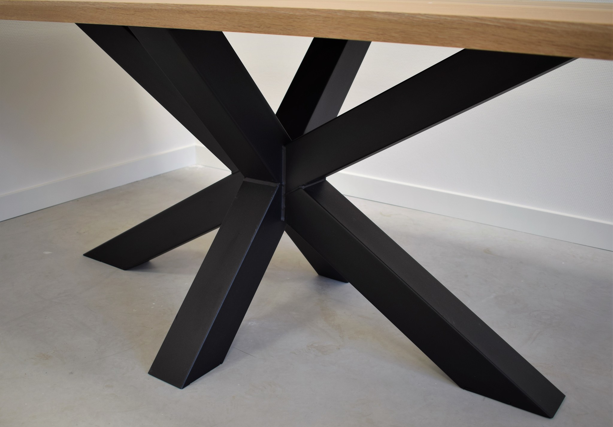 Bij de stalen 3D spin poot hebt u eigenlijk een zwevend effect, dit zorgt ervoor dat u rondom de tafel goed kunt zitten zonder dat de tafelpoot in de weg zit voor de stoelen. Uw volledige gekozen lengte van het tafelblad is dan ook direct de ruimte die u hebt voor de stoelen.