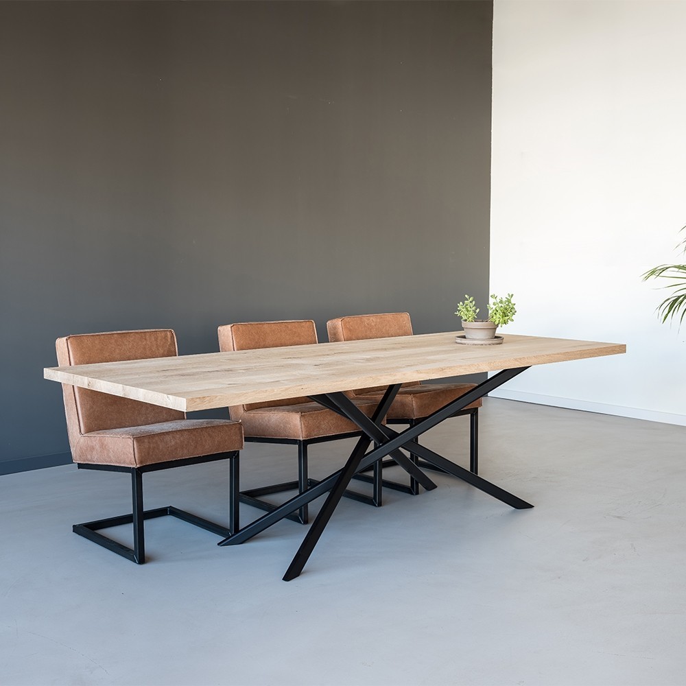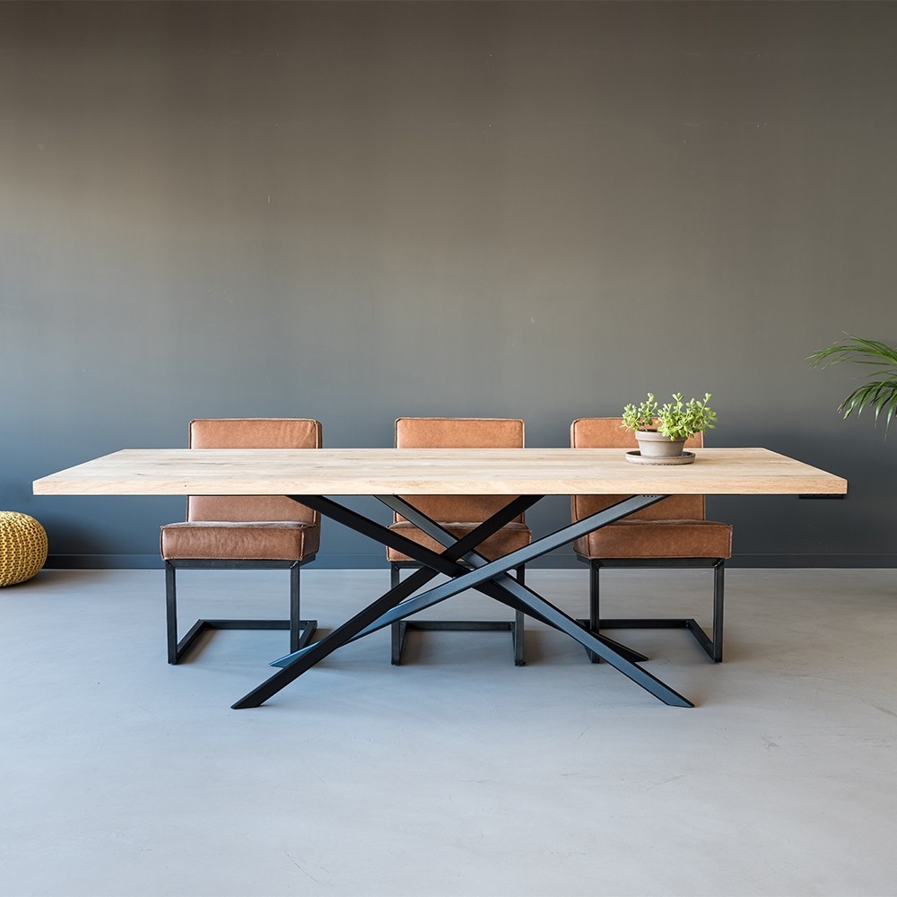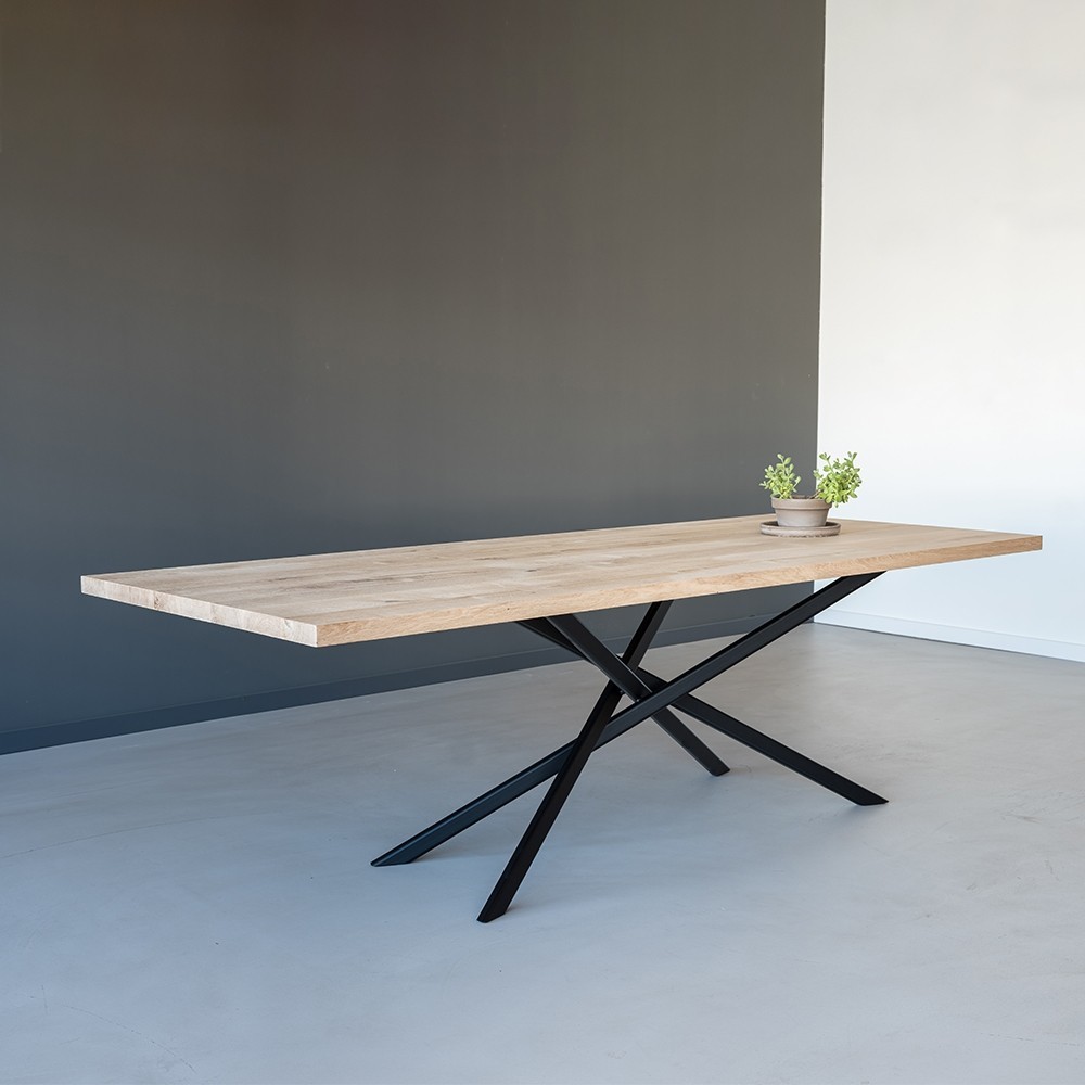 Prachtige eiken eettafel met stalen Fio poot. Het eiken tafelblad is gemaakt van eikenhout afkomstig uit Frankrijk, doordat wij het gehele proces zelf in de hand hebben garanderen wij de hoogste kwaliteit voor de beste prijs. Het hout wordt vakkundig gedroogd en bewerkt, wij zorgen er altijd voor dat al het hout met een FSC keuring wordt afgegeven. Het tafelblad wordt altijd netjes glad afgewerkt en is gemakkelijk met een vochtige doek schoon te maken. De tafelbladen zijn +- 43mm dik massief! De hoogte van de grond af gemeten tot aan bovenkant tafelblad is 77cm. De stalen poten worden compleet gepoedercoat, hierdoor krast het niet als u er met de voet of stoel tegen aan komt. Ook gaat het hierdoor niet roesten, ideaal in gebruik dus!