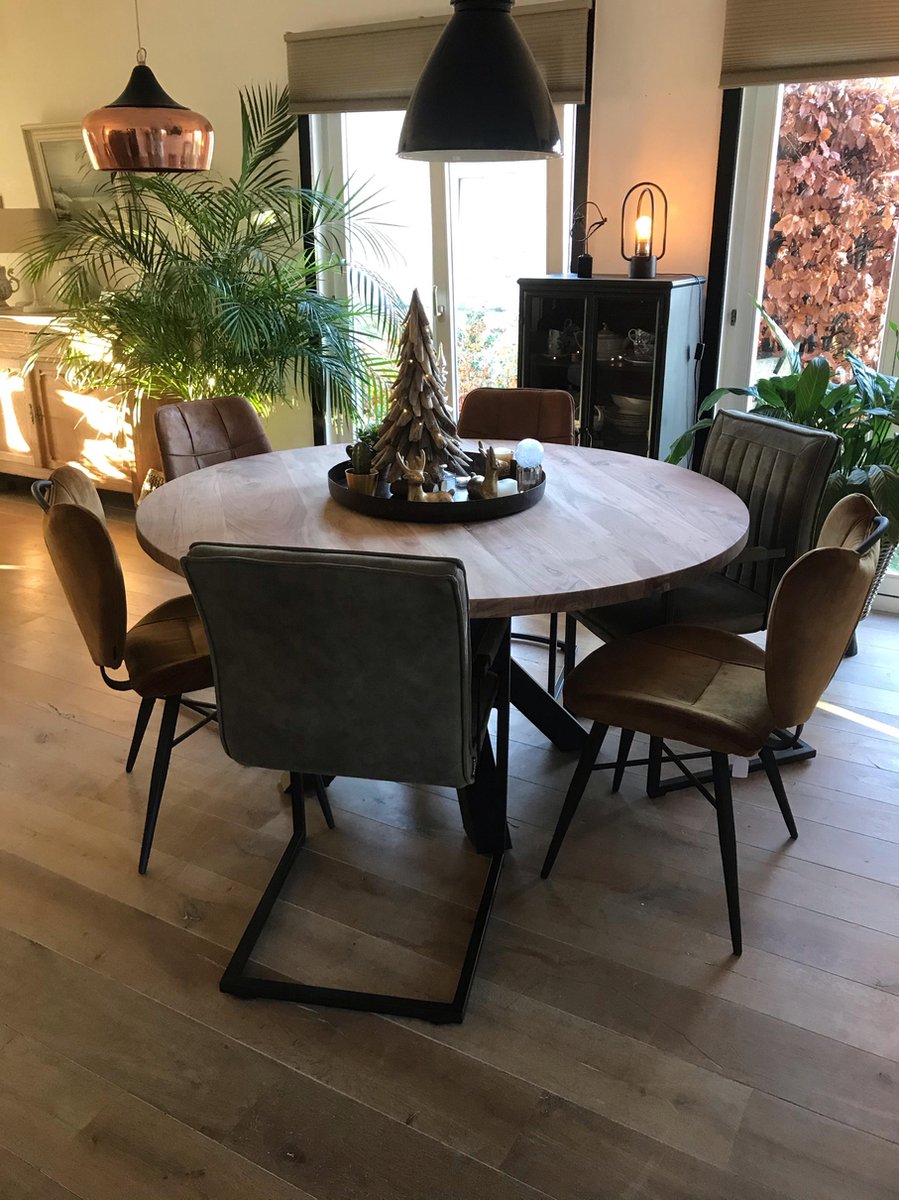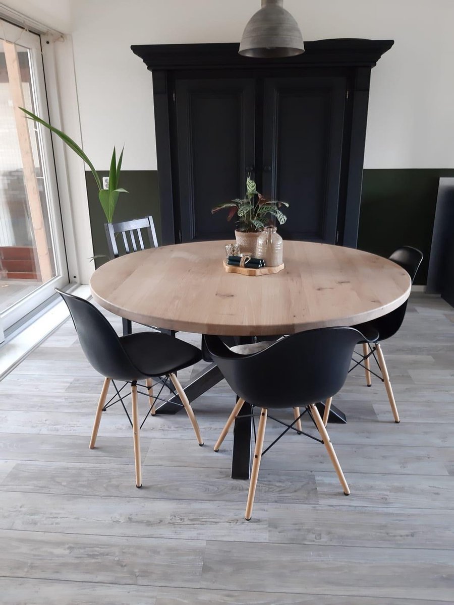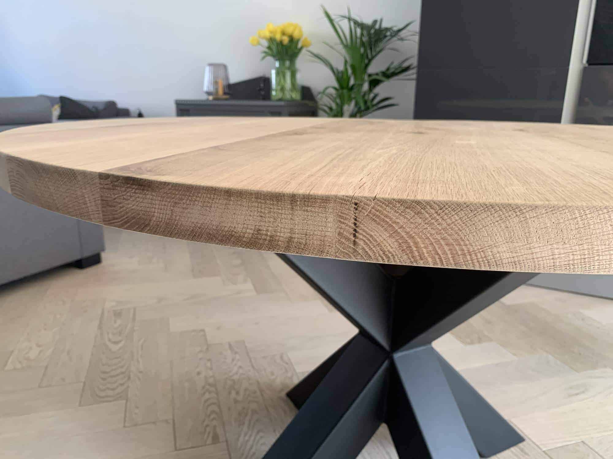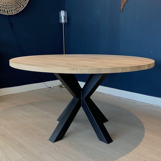 Prachtige eiken eettafel rond met stalen 3D spin poot. Het eiken tafelblad is gemaakt van eikenhout afkomstig uit Frankrijk, doordat wij het gehele proces zelf in de hand hebben garanderen wij de hoogste kwaliteit voor de beste prijs. Het hout wordt vakkundig gedroogd en bewerkt, wij zorgen er altijd voor dat al het hout met een FSC keuring wordt afgegeven. Het tafelblad wordt altijd netjes glad afgewerkt en is gemakkelijk met een vochtige doek schoon te maken. De tafelbladen zijn +- 4cmm dik volledig massief! De hoogte van de grond af gemeten tot aan bovenkant tafelblad is 76,5cm. De stalen poten worden compleet gepoedercoat, hierdoor krast het niet als u er met de voet of stoel tegen aan komt. Ook gaat het hierdoor niet roesten, ideaal in gebruik dus!