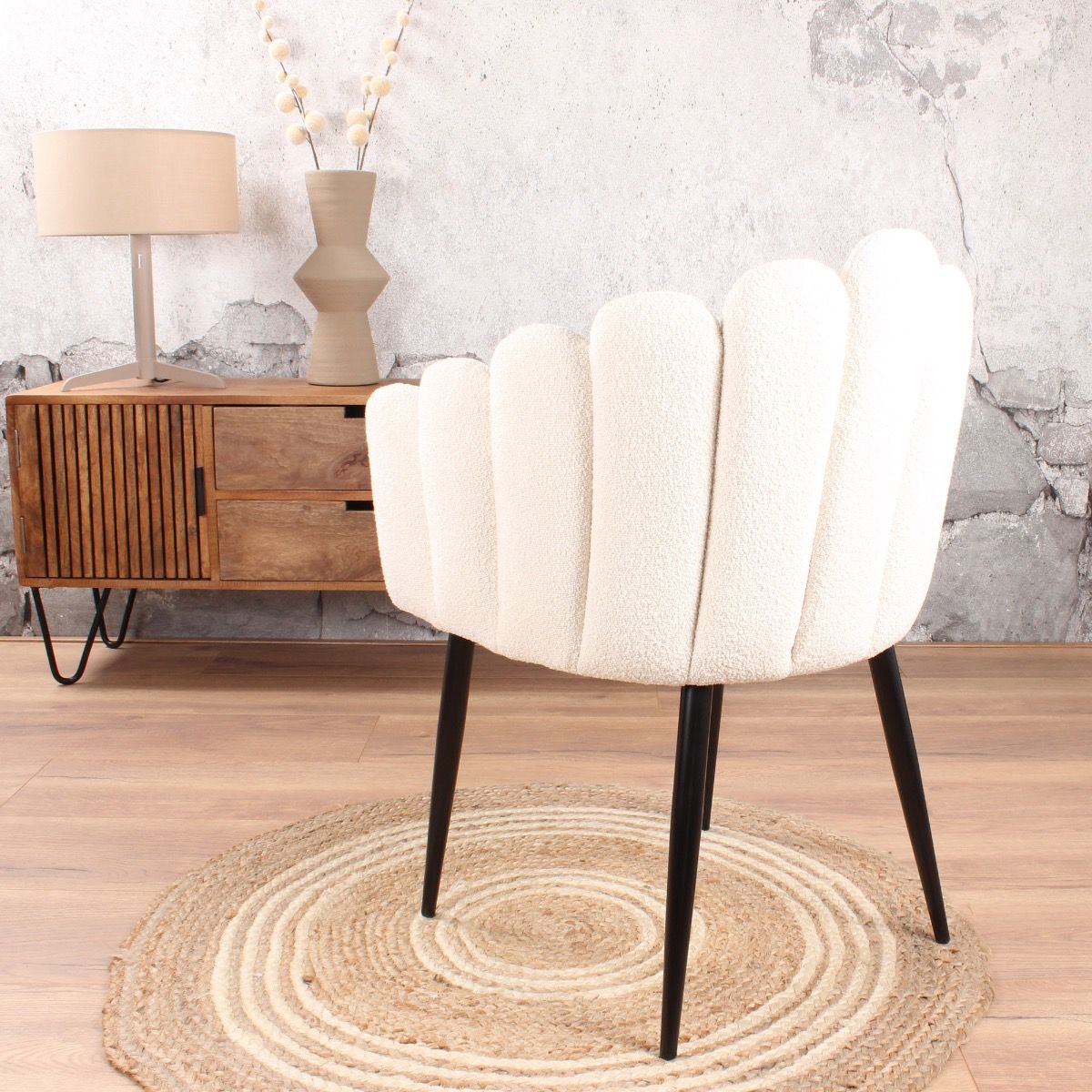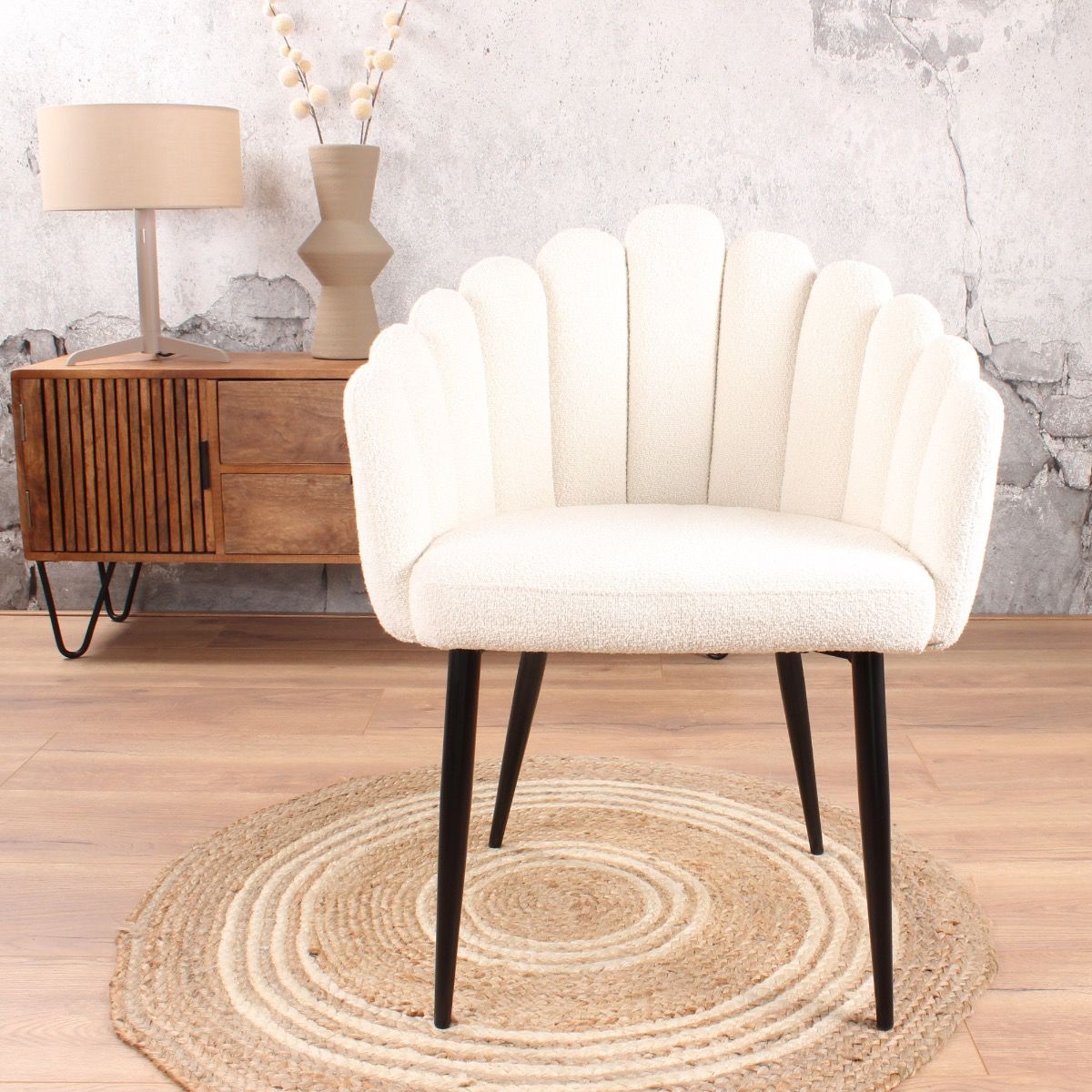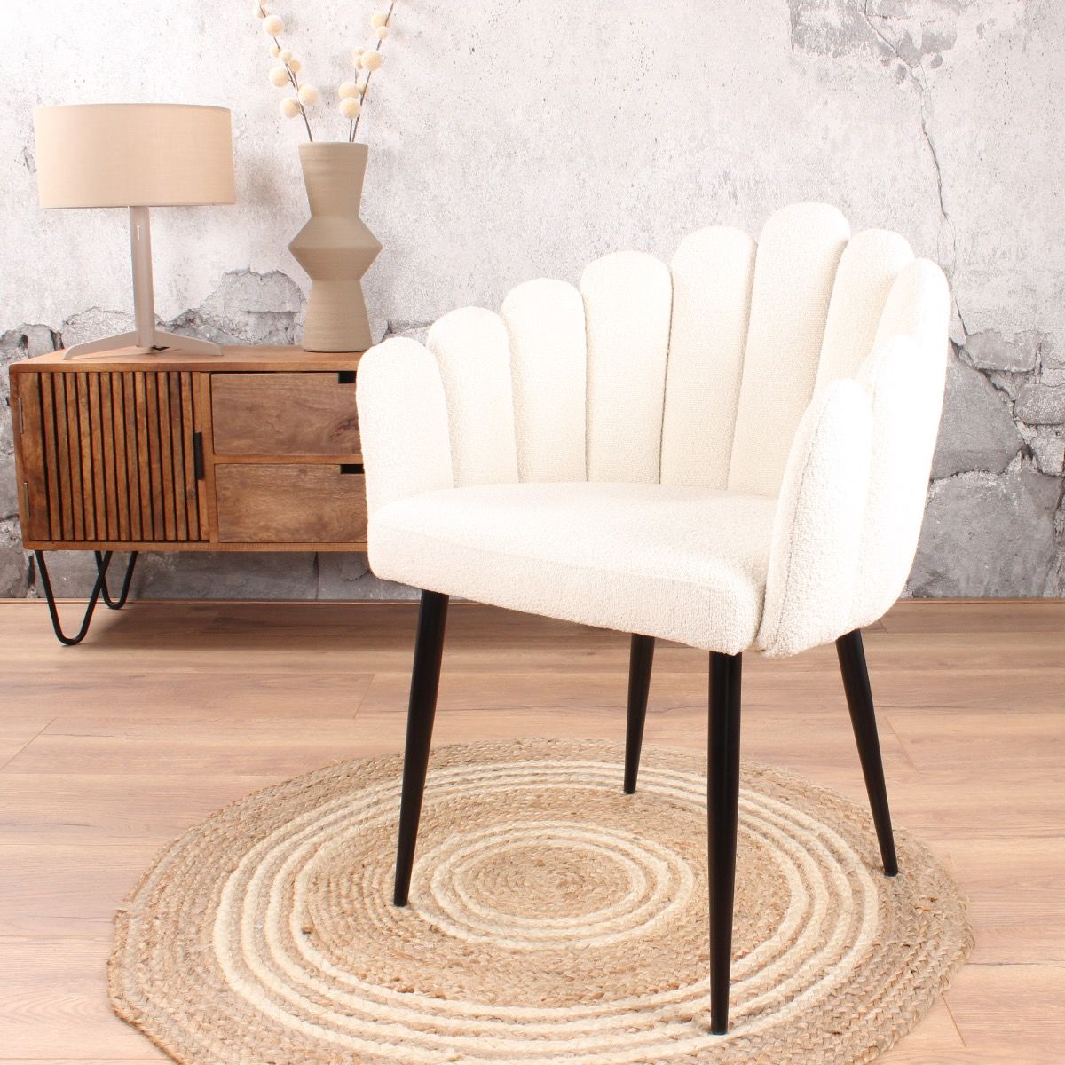 Wil jij graag een stijlvolle, unieke en bijzondere eetkamerstoel in de (woon)keuken? Dan is de Flow van ons eigen woonmerk wellicht de perfecte keuze. Deze leuke eetkamerstoel valt op door zijn mooie vorm en materiaalgebruik. Flow is het perfecte voorbeeld van een goede prijs-kwaliteitsverhouding. Flow is verkrijgbaar in een boucle bekleding in de kleuren wit, beige of grijs. Voor ieder interieur een passend alternatief. Daarnaast wordt het chique gevoel versterkt door de stevige, zwarte, metalen poten. De eetkamerstoel zit niet alleen heerlijk, maar hij oogt ook erg leuk. Ideaal voor aan jouw eettafel.