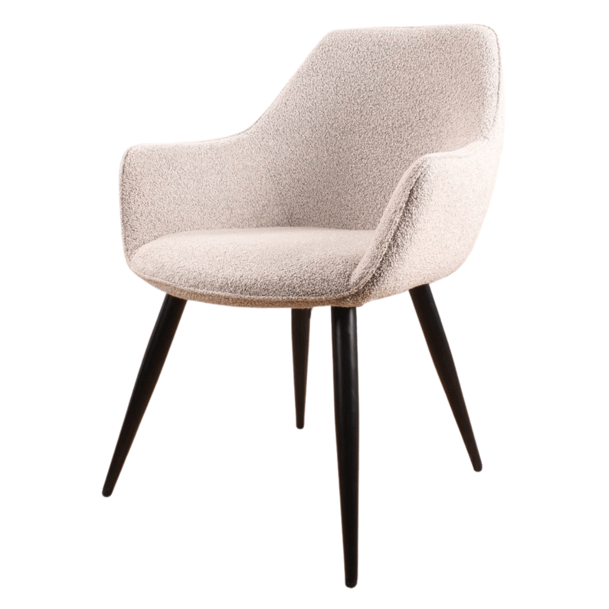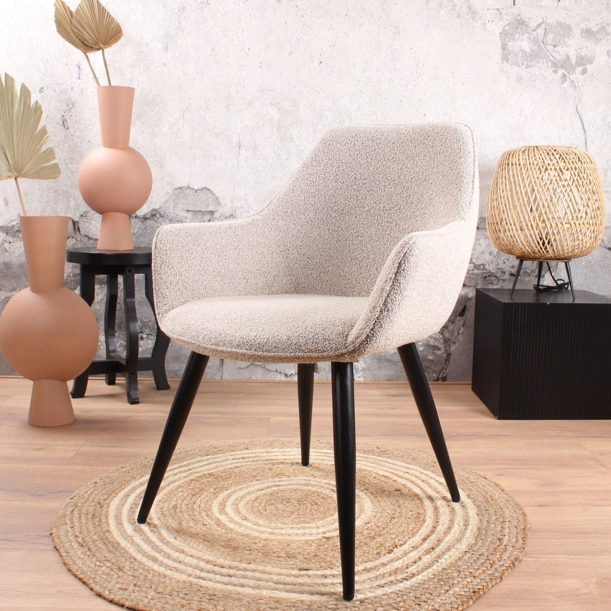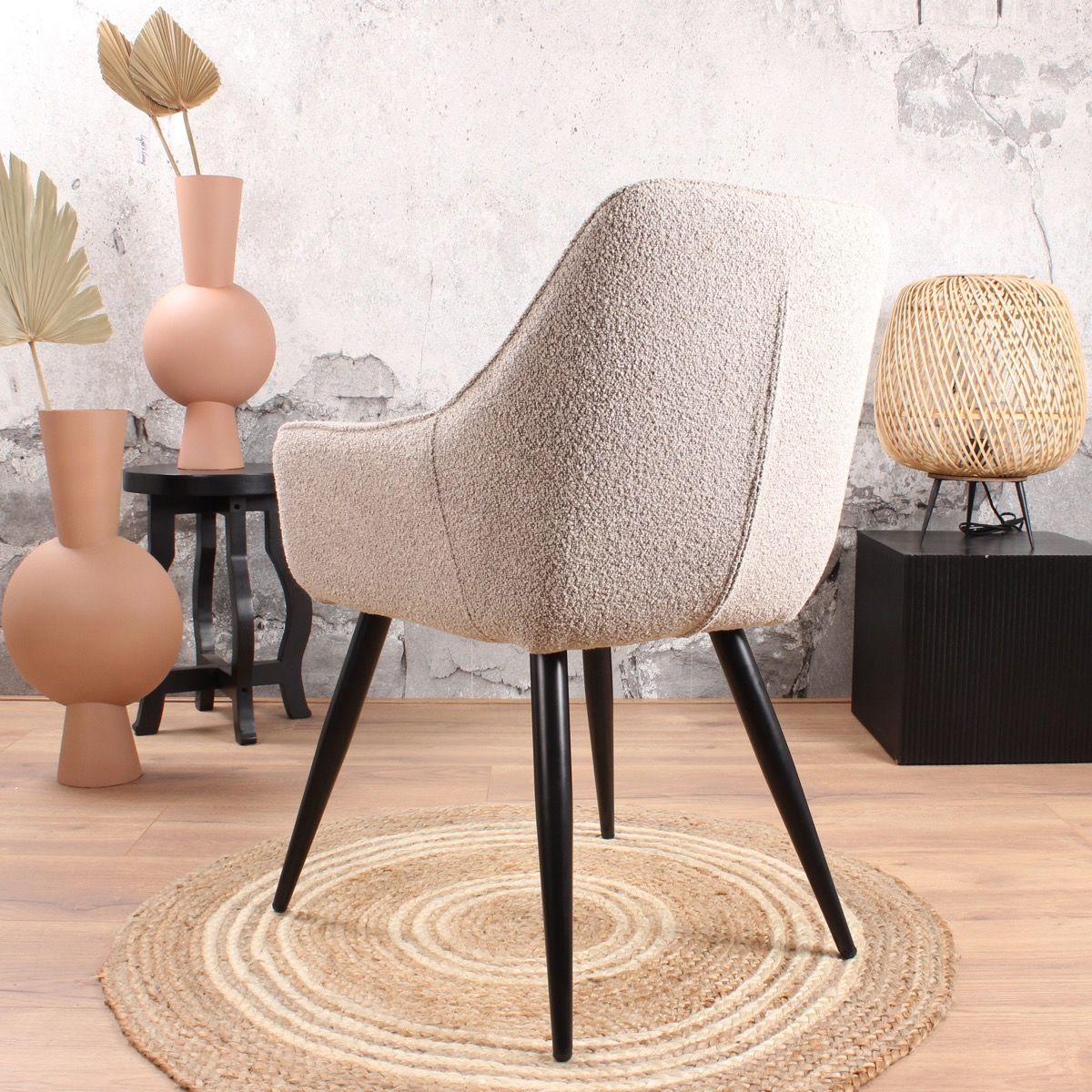 De geliefde Rav eetkamerstoel 2.0 in een nieuw (zacht) jasje. Deze Rav eetkamerstoel is bekleed met een prachtige bouclé stof. Dit geeft deze comfortabel eetkamerstoel een chique uitstraling, helemaal van deze tijd. Ravi bouclé is verkrijgbaar in wit, grijs of beige. Voor ieder wat wils. De zitting is bevestigd op een stevig metalen onderstel in de kleur zwart. Bouclé is helemaal van nu, deze eetkamerstoel past dan ook binnen een Scandinavisch, tijdloos en modern interieur. De stof voelt heerlijk zacht aan en heeft een prettige uitstraling.