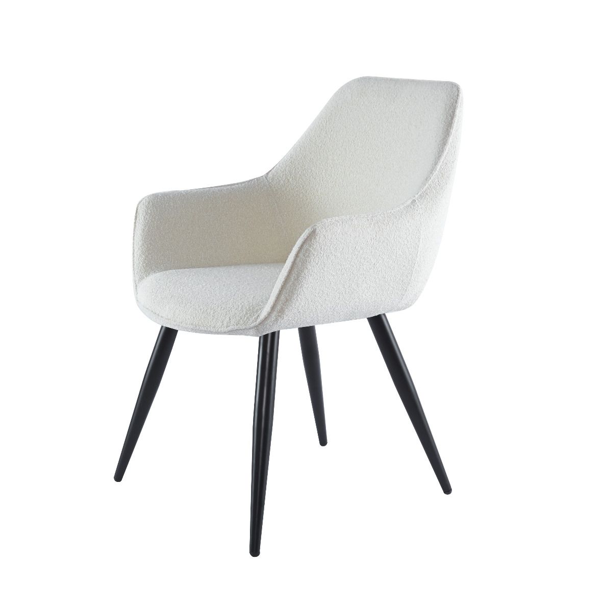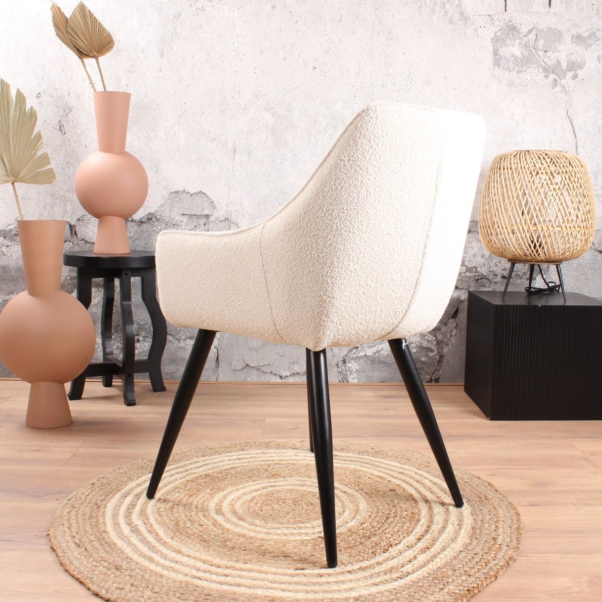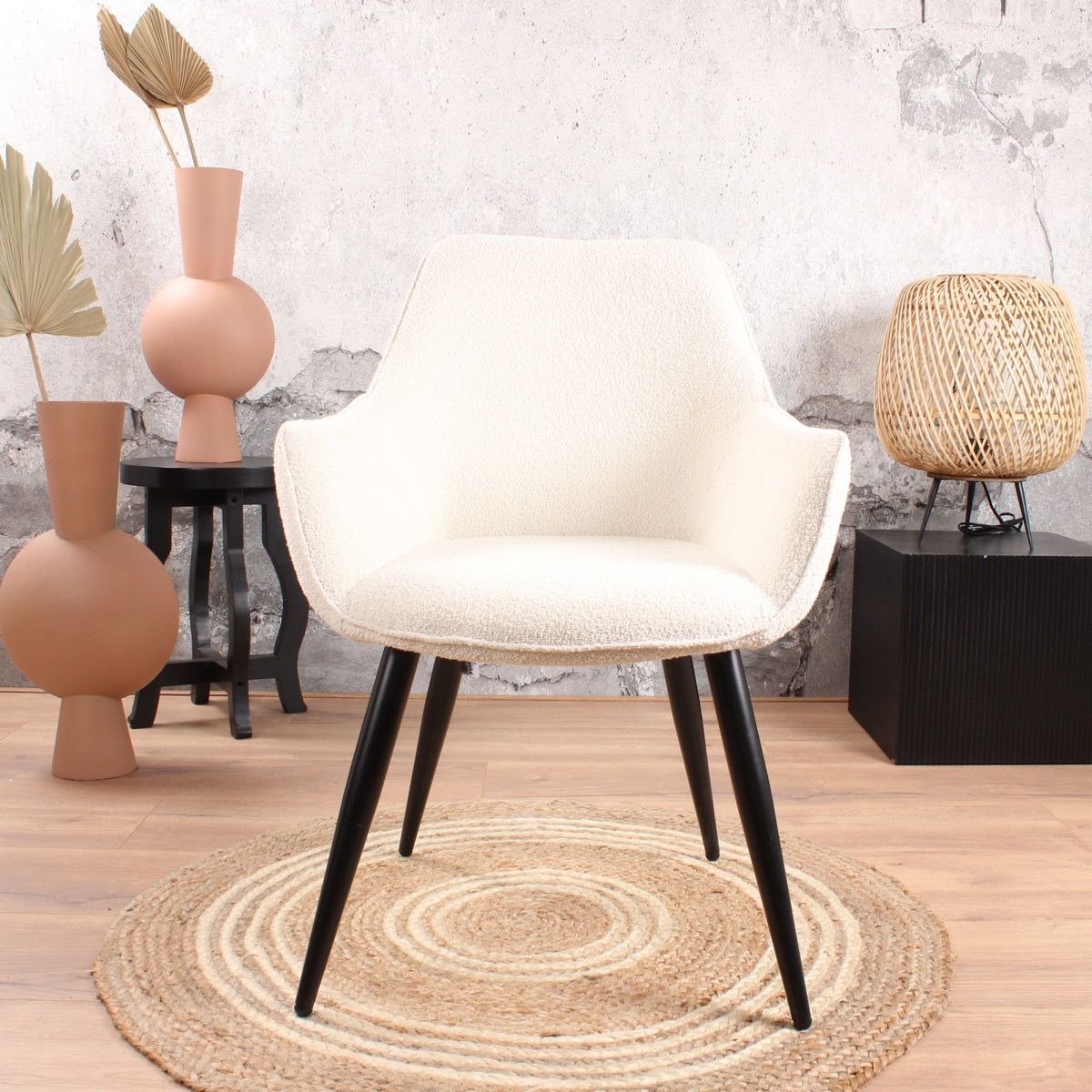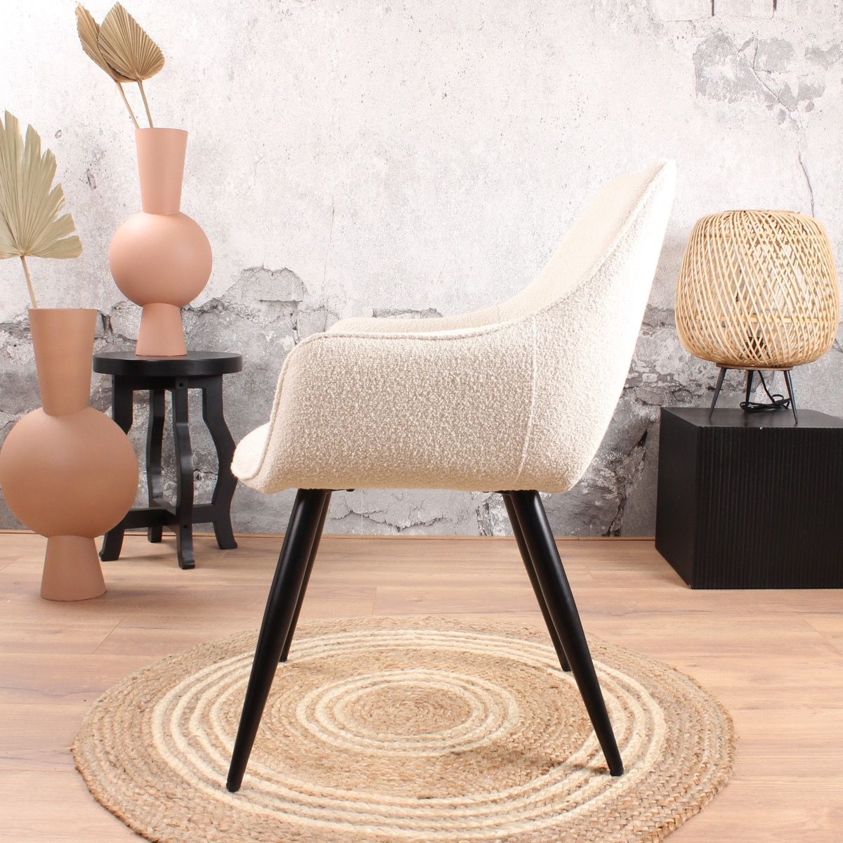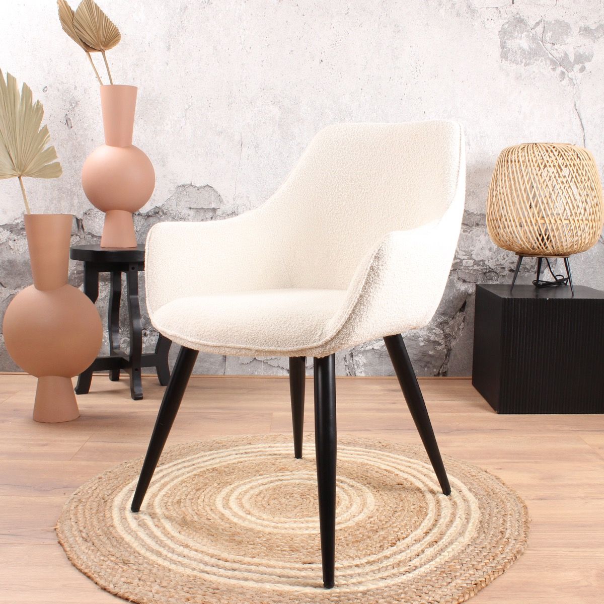 De geliefde Rav eetkamerstoel 2.0 in een nieuw (zacht) jasje. Deze Rav eetkamerstoel is bekleed met een prachtige bouclé stof. Dit geeft deze comfortabel eetkamerstoel een chique uitstraling, helemaal van deze tijd. Ravi bouclé is verkrijgbaar in wit of beige. Rav is voorzien van een ruitpatroon in de rugleuning en een armleuning. De zitting is bevestigd op een stevig metalen onderstel in de kleur zwart. Bouclé is helemaal van nu, deze eetkamerstoel past dan ook binnen een Scandinavisch, tijdloos en modern interieur. De stof voelt heerlijk zacht aan en heeft een prettige uitstraling.