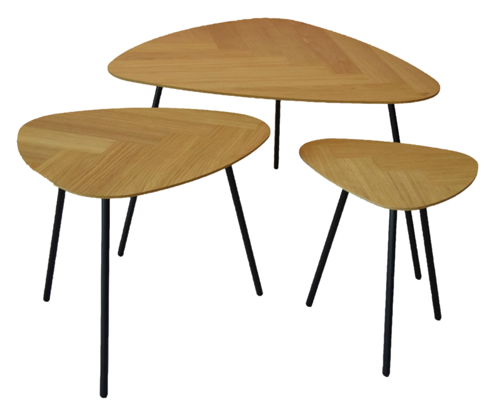 De Ohio set combineert praktisch gemak met een warme, eiken uitstraling. De drie tafeltjes hebben elk hun eigen formaat, zodat je ze samen kunt stylen of los kunt gebruiken. De visgraatlook geeft ze een stijlvolle touch, terwijl het slanke onderstel zorgt voor een luchtige, moderne look.