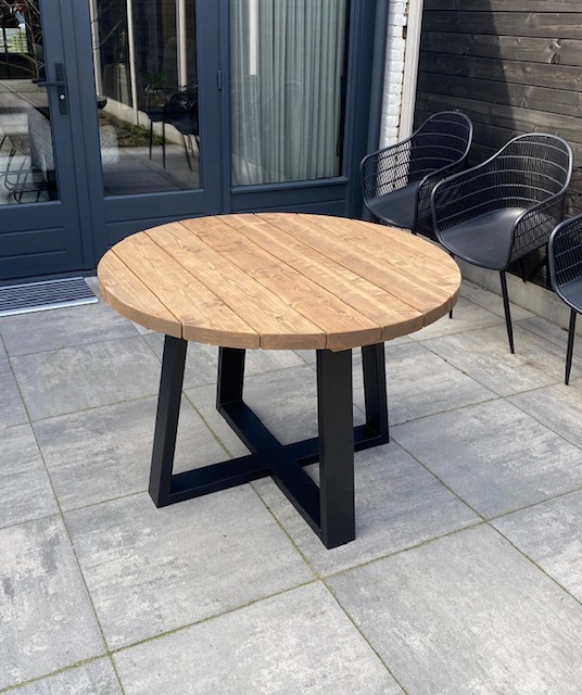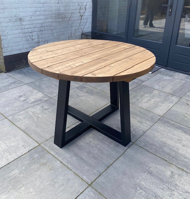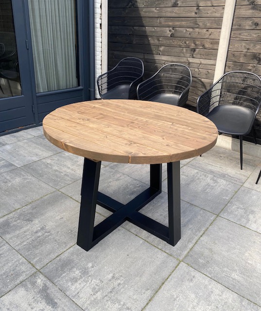 De hardloper in de tuintafels bij tafelplein! Deze prachtige ronde tuintafel is gemaakt van gebrand en bewerkt kloosterhout de tafel is voorzien van een speciale bruine Nano coating waardoor het hout niet gaat rotten of verkleuren! Een prachtige tafel in combinatie met een stalen zwart of wit gepoedercoat onderstel. Doordat wij het gehele proces zelf in de hand hebben garanderen wij de hoogste kwaliteit voor de beste prijs. Het hout wordt vakkundig gedroogd en bewerkt, wij zorgen er altijd voor dat al het hout met een FSC keuring wordt afgegeven. De Nano coating die wordt aangebracht in combinatie met de kieren a 1cm tussen de delen zorgen ervoor dat het regenwater er altijd direct afloopt en de tafel dus zo het gehele jaar buiten kan staan! Het tafelblad wordt altijd netjes glad afgewerkt en is gemakkelijk met een vochtige doek schoon te maken. De tafelbladen zijn +- 45mm dik massief! De hoogte van de grond af gemeten tot aan bovenkant tafelblad is 76,5cm. De stalen poten worden compleet gepoedercoat, hierdoor krast het niet als u er met de voet of stoel tegen aan komt. Ook gaat het hierdoor niet roesten, ideaal in gebruik dus!