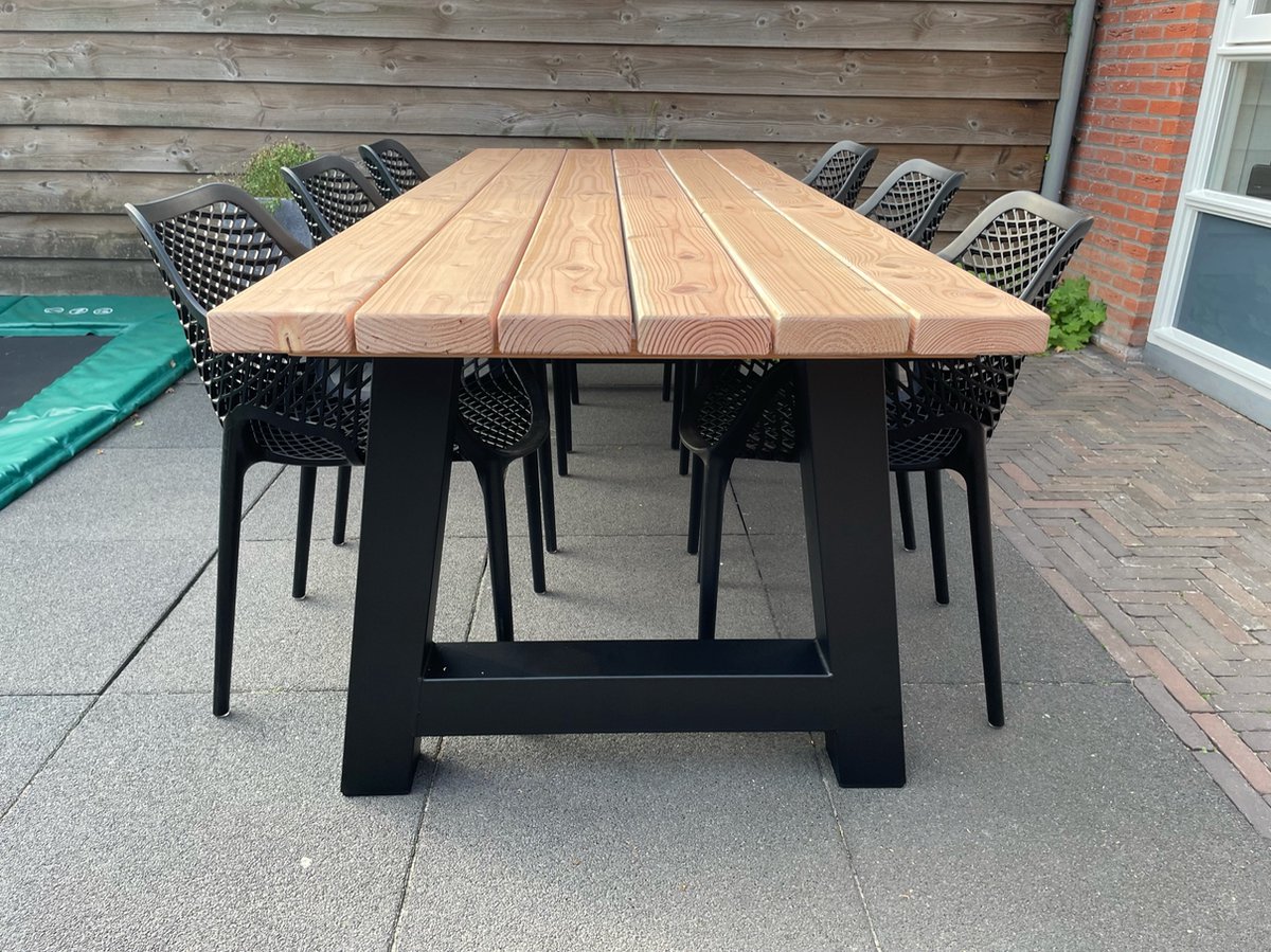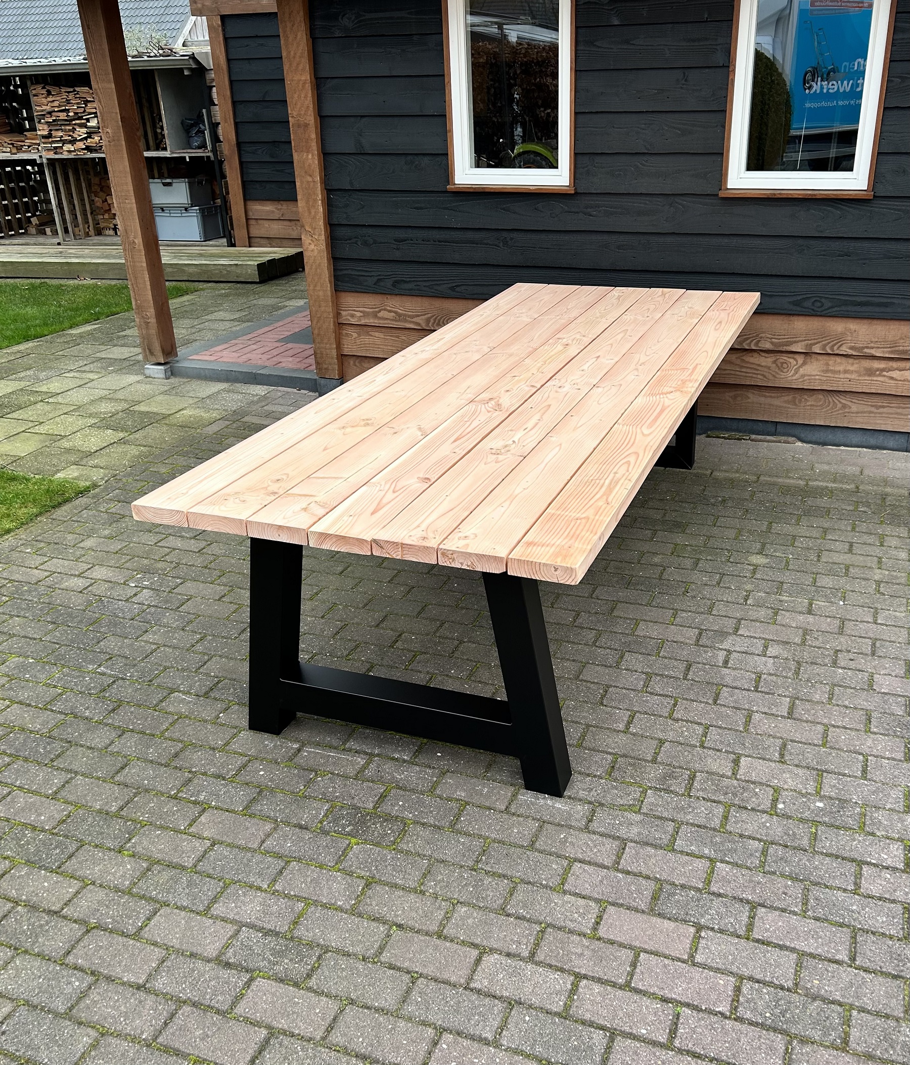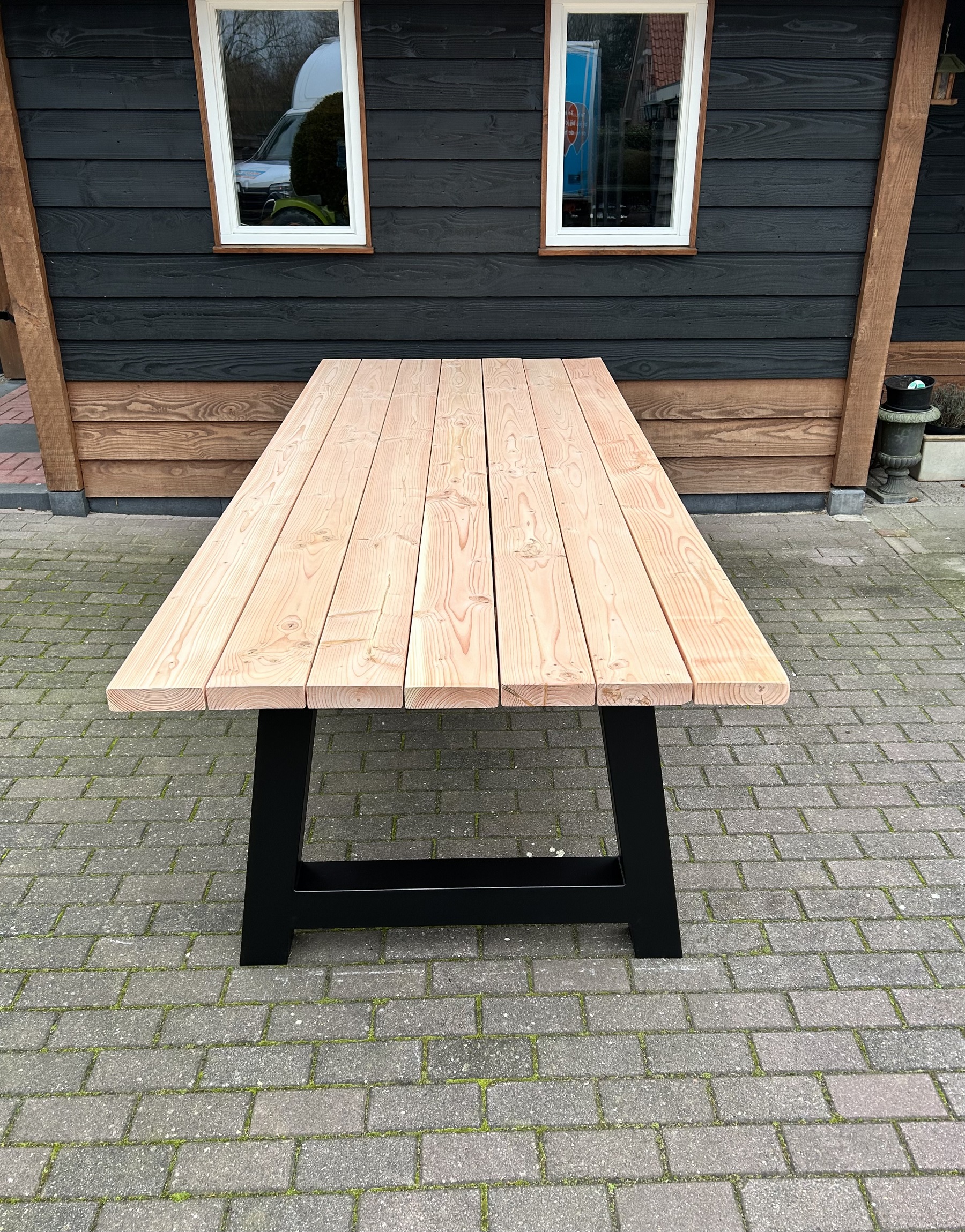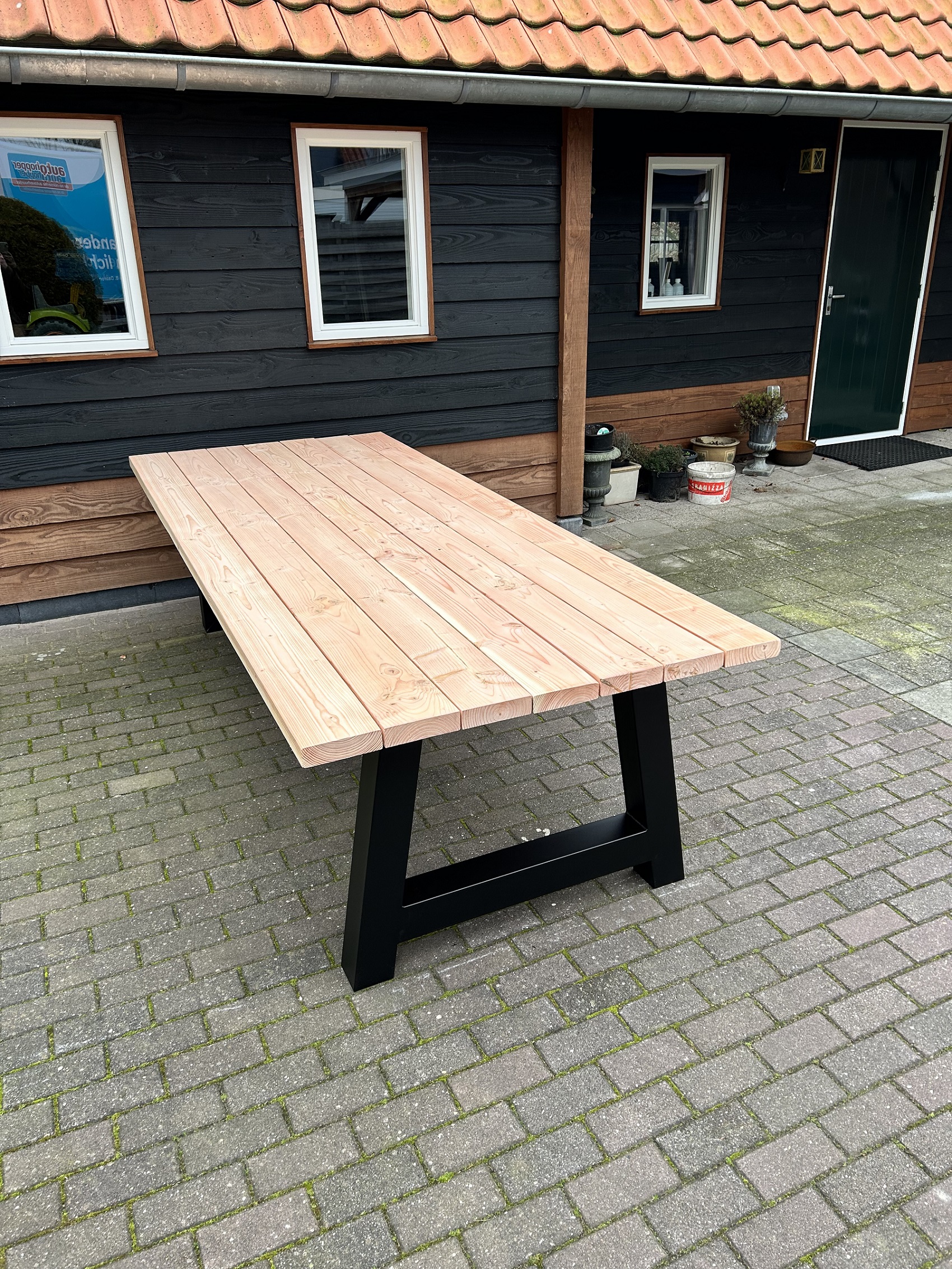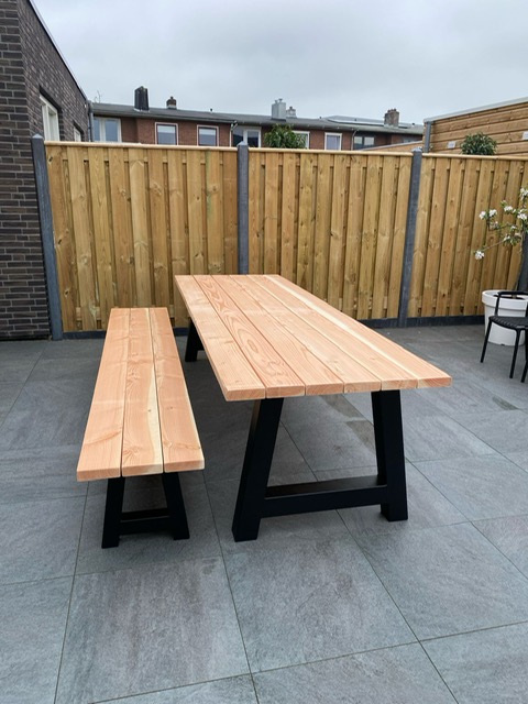 Prachtige Douglas tuintafel met stalen A poot. Het tafelblad is gemaakt van Douglas hout. Doordat wij het gehele proces zelf in de hand hebben garanderen wij de hoogste kwaliteit voor de beste prijs. Daarnaast wordt het hout vakkundig gedroogd en bewerkt, wij zorgen er altijd voor dat al het hout met een FSC keuring wordt afgegeven. Verder zorgt een Nano coating die wordt aangebracht, in combinatie met de kieren a 5-7mm tussen de delen, ervoor dat regenwater er altijd direct afloopt en de tafel dus zo het gehele jaar buiten kan staan! Het tafelblad wordt altijd netjes glad afgewerkt en is gemakkelijk met een vochtige doek schoon te maken. Verder zijn de tafelbladen +/- 45mm dik massief en is de hoogte van de grond af gemeten tot aan bovenkant tafelblad 76,5cm en +-72cm onderkantblad. De stalen poten worden compleet gepoedercoat, hierdoor krast het niet als u er met de voet of stoel tegen aan komt. Ook gaat het hierdoor niet roesten, ideaal in buiten gebruik dus!