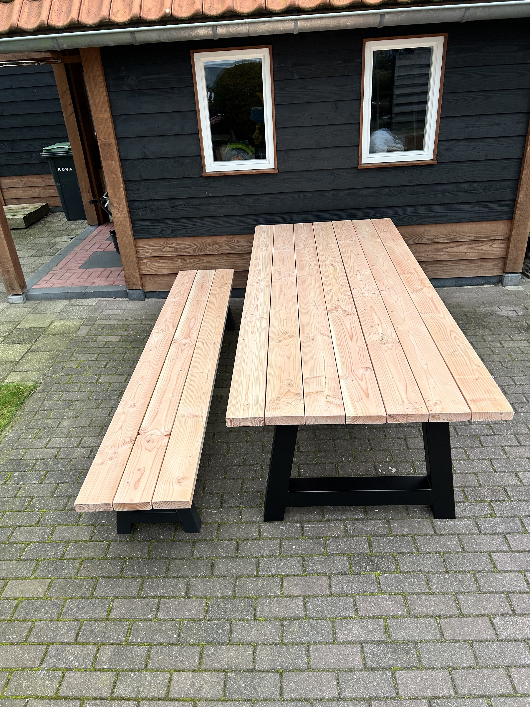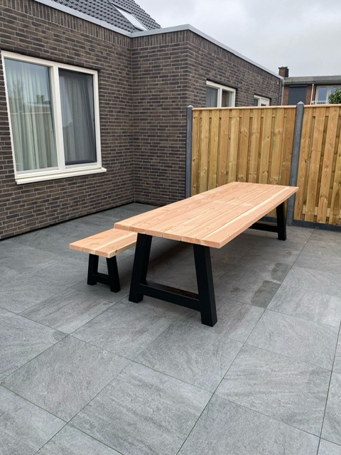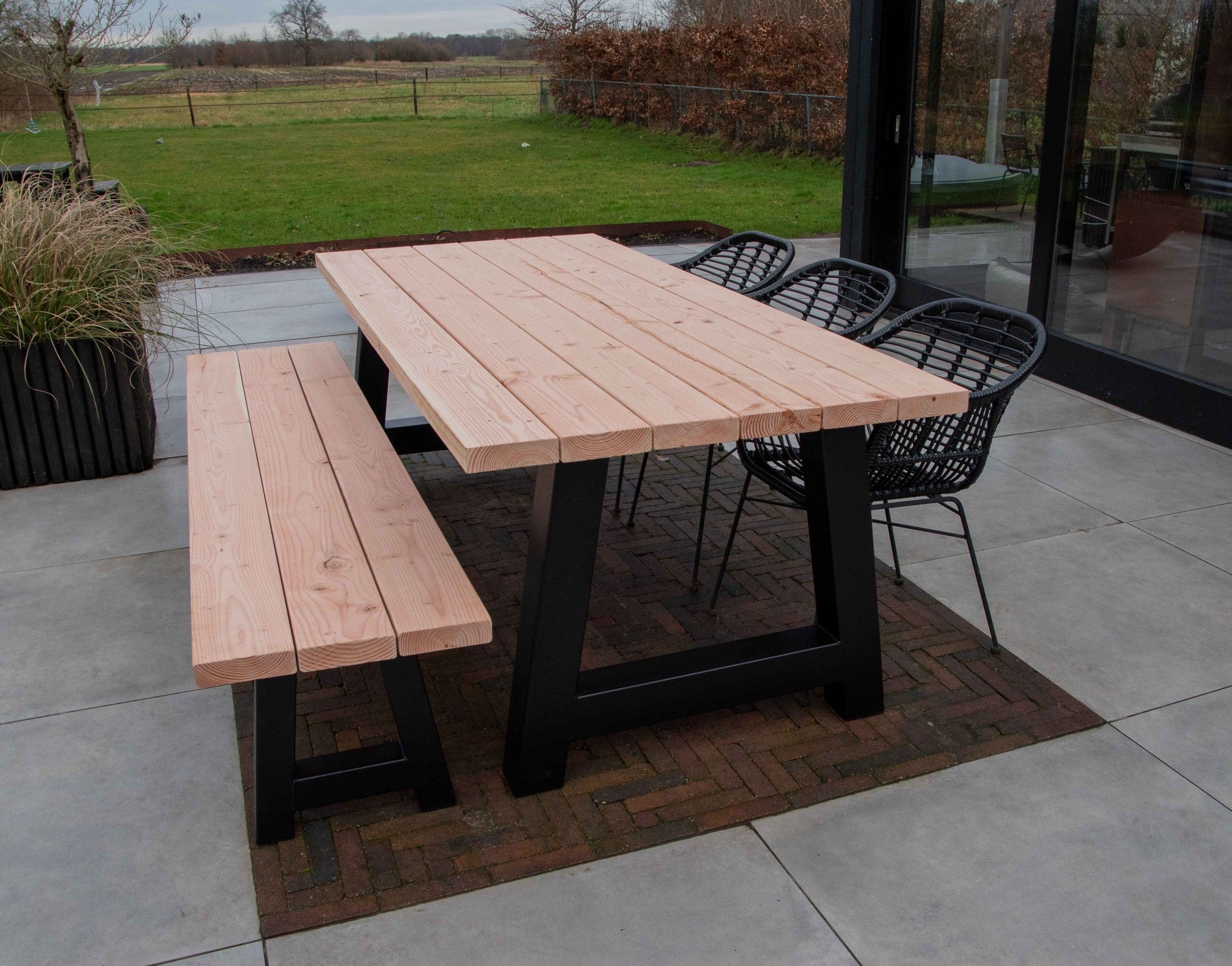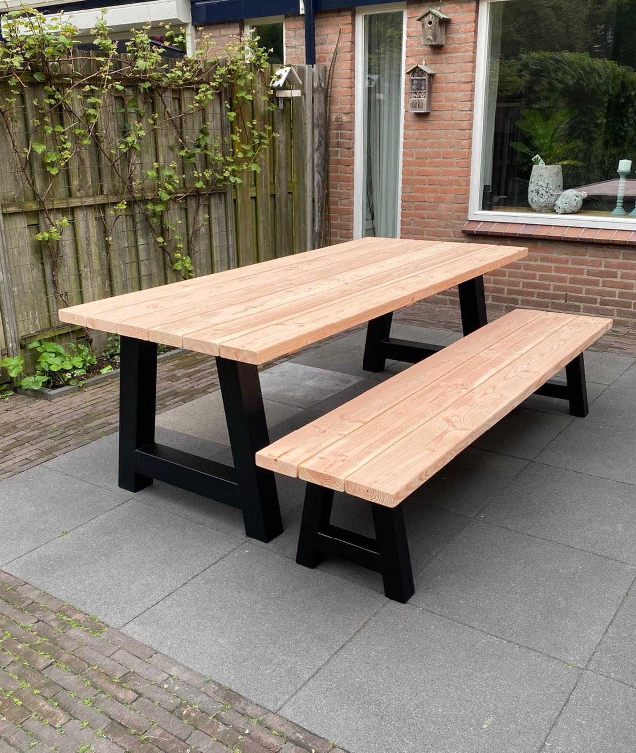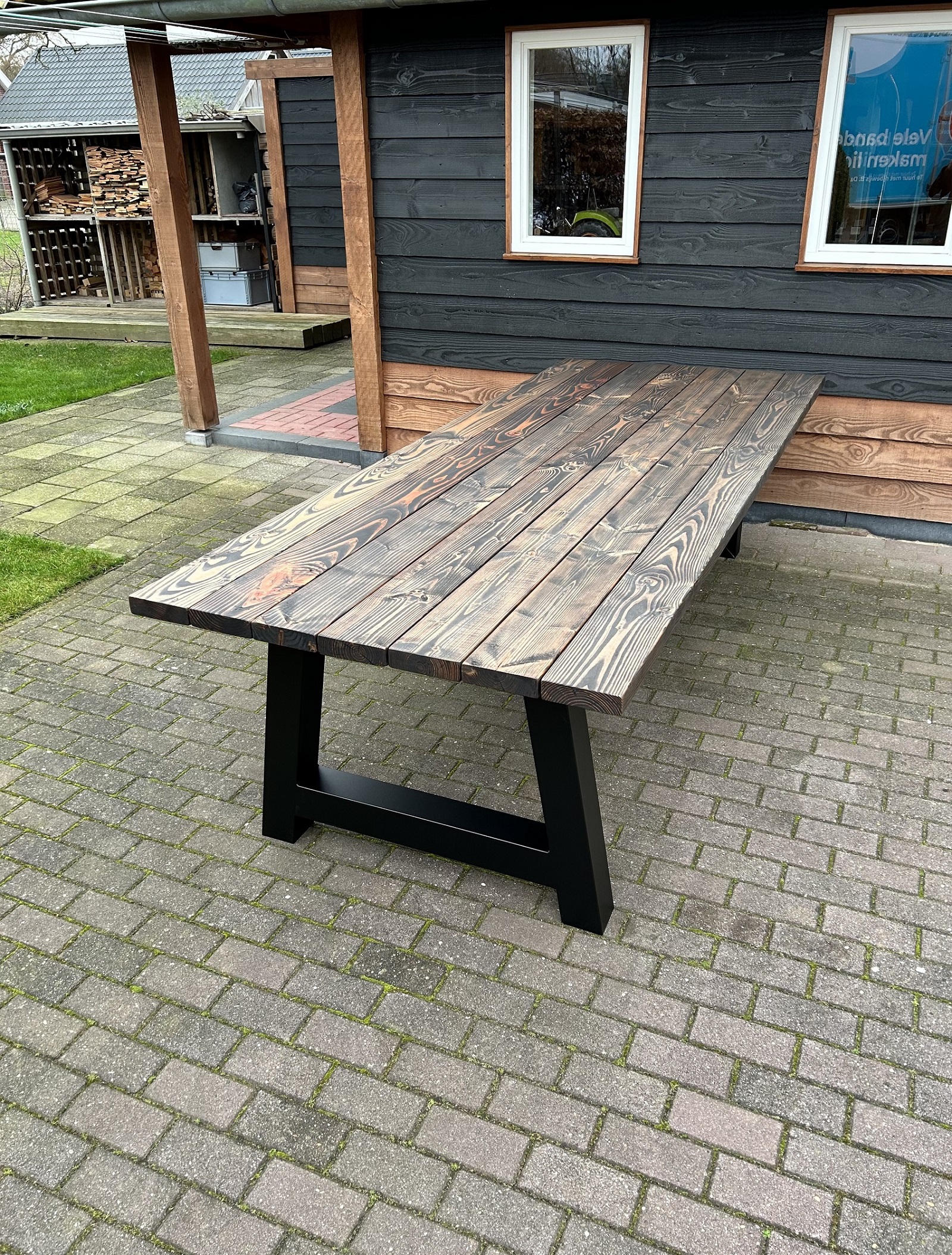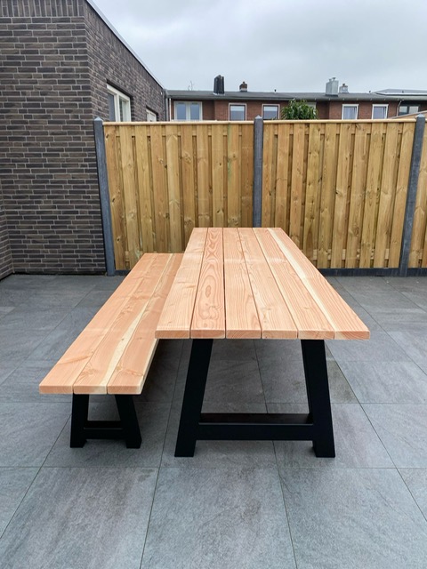 Prachtige Douglas tuintafel met stalen A poot. Het tafelblad is gemaakt van Douglas hout. Doordat wij het gehele proces zelf in de hand hebben garanderen wij de hoogste kwaliteit voor de beste prijs. Daarnaast wordt het hout vakkundig gedroogd en bewerkt, wij zorgen er altijd voor dat al het hout met een FSC keuring wordt afgegeven. Verder zorgt een Nano coating die wordt aangebracht, in combinatie met de kieren a 5-7mm tussen de delen, ervoor dat regenwater er altijd direct afloopt en de tafel dus zo het gehele jaar buiten kan staan! Het tafelblad wordt altijd netjes glad afgewerkt en is gemakkelijk met een vochtige doek schoon te maken. Verder zijn de tafelbladen +/- 45mm dik massief en is de hoogte van de grond af gemeten tot aan bovenkant tafelblad 76,5cm en +-72cm onderkantblad. De stalen poten worden compleet gepoedercoat, hierdoor krast het niet als u er met de voet of stoel tegen aan komt. Ook gaat het hierdoor niet roesten, ideaal in buiten gebruik dus!