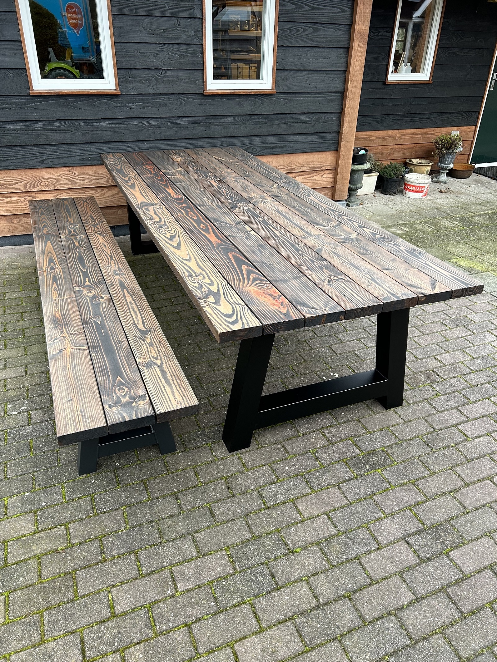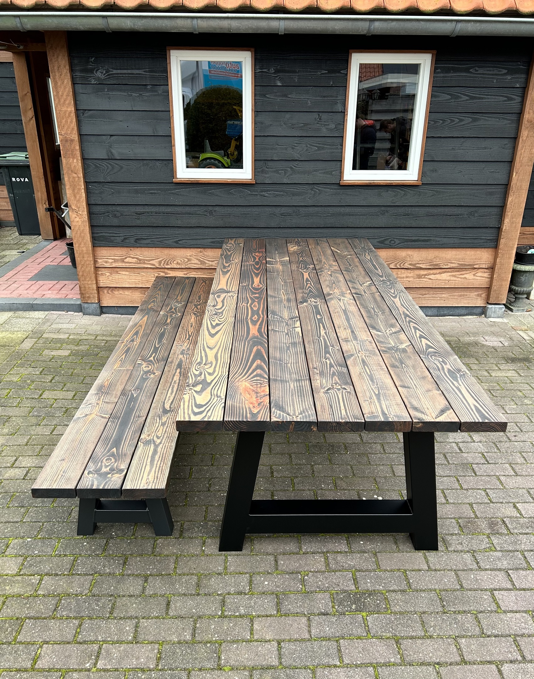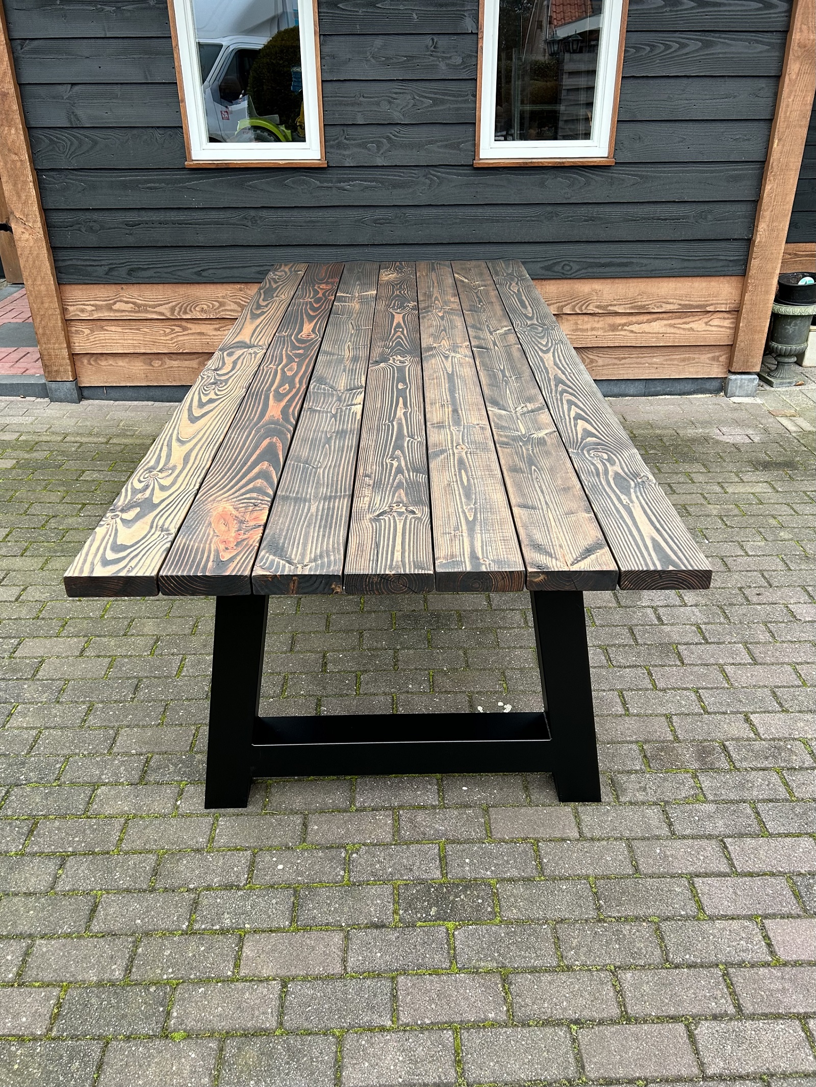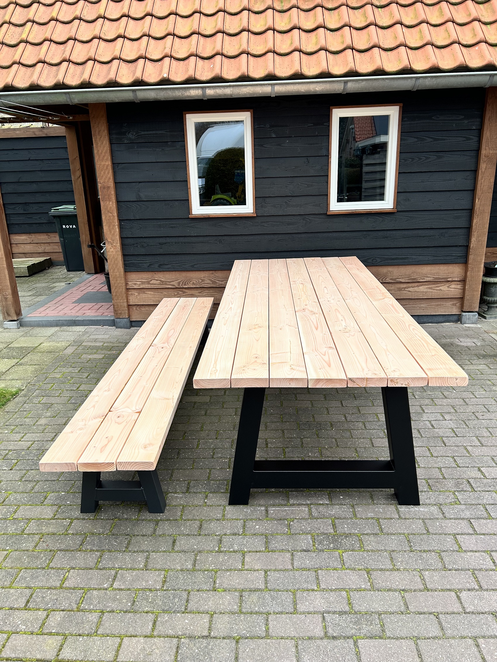 Prachtige Douglas tuintafel met stalen A poot. Het tafelblad is gemaakt van Douglas hout. Doordat wij het gehele proces zelf in de hand hebben garanderen wij de hoogste kwaliteit voor de beste prijs. Daarnaast wordt het hout vakkundig gedroogd en bewerkt, wij zorgen er altijd voor dat al het hout met een FSC keuring wordt afgegeven. Verder zorgt een Nano coating die wordt aangebracht, in combinatie met de kieren a 5-7mm tussen de delen, ervoor dat regenwater er altijd direct afloopt en de tafel dus zo het gehele jaar buiten kan staan! Het tafelblad wordt altijd netjes glad afgewerkt en is gemakkelijk met een vochtige doek schoon te maken. Verder zijn de tafelbladen +/- 45mm dik massief en is de hoogte van de grond af gemeten tot aan bovenkant tafelblad 76,5cm en +-72cm onderkantblad. De stalen poten worden compleet gepoedercoat, hierdoor krast het niet als u er met de voet of stoel tegen aan komt. Ook gaat het hierdoor niet roesten, ideaal in buiten gebruik dus!