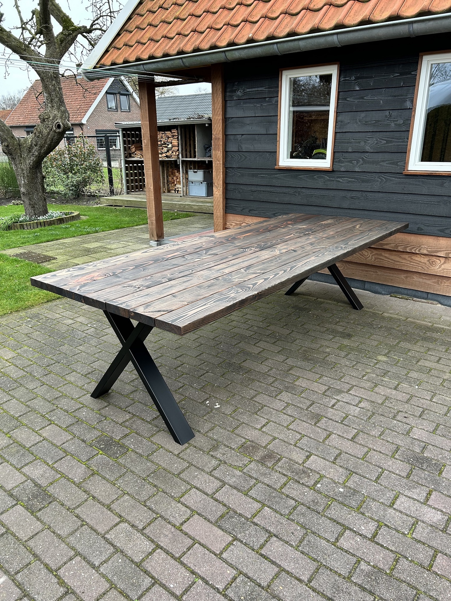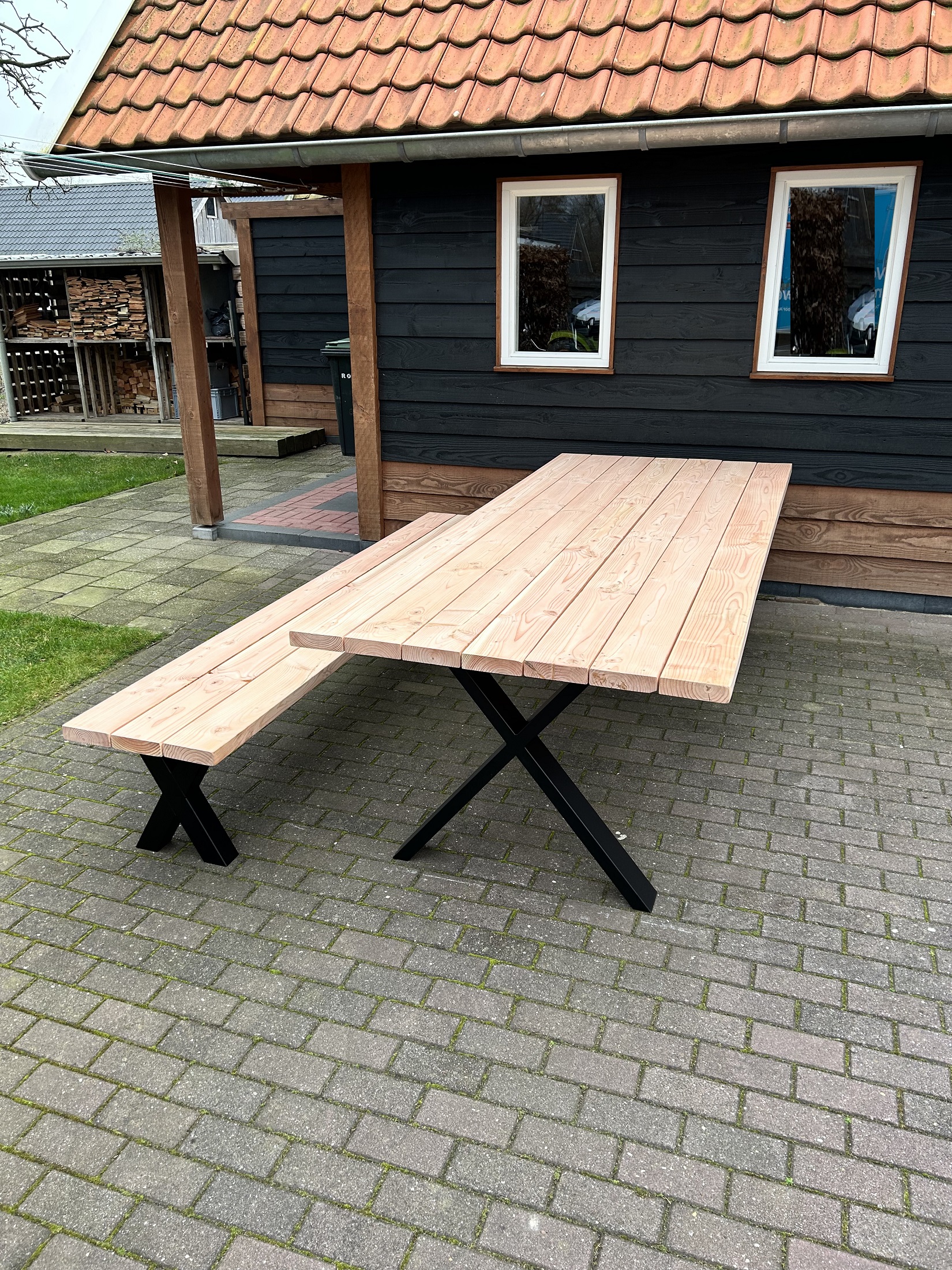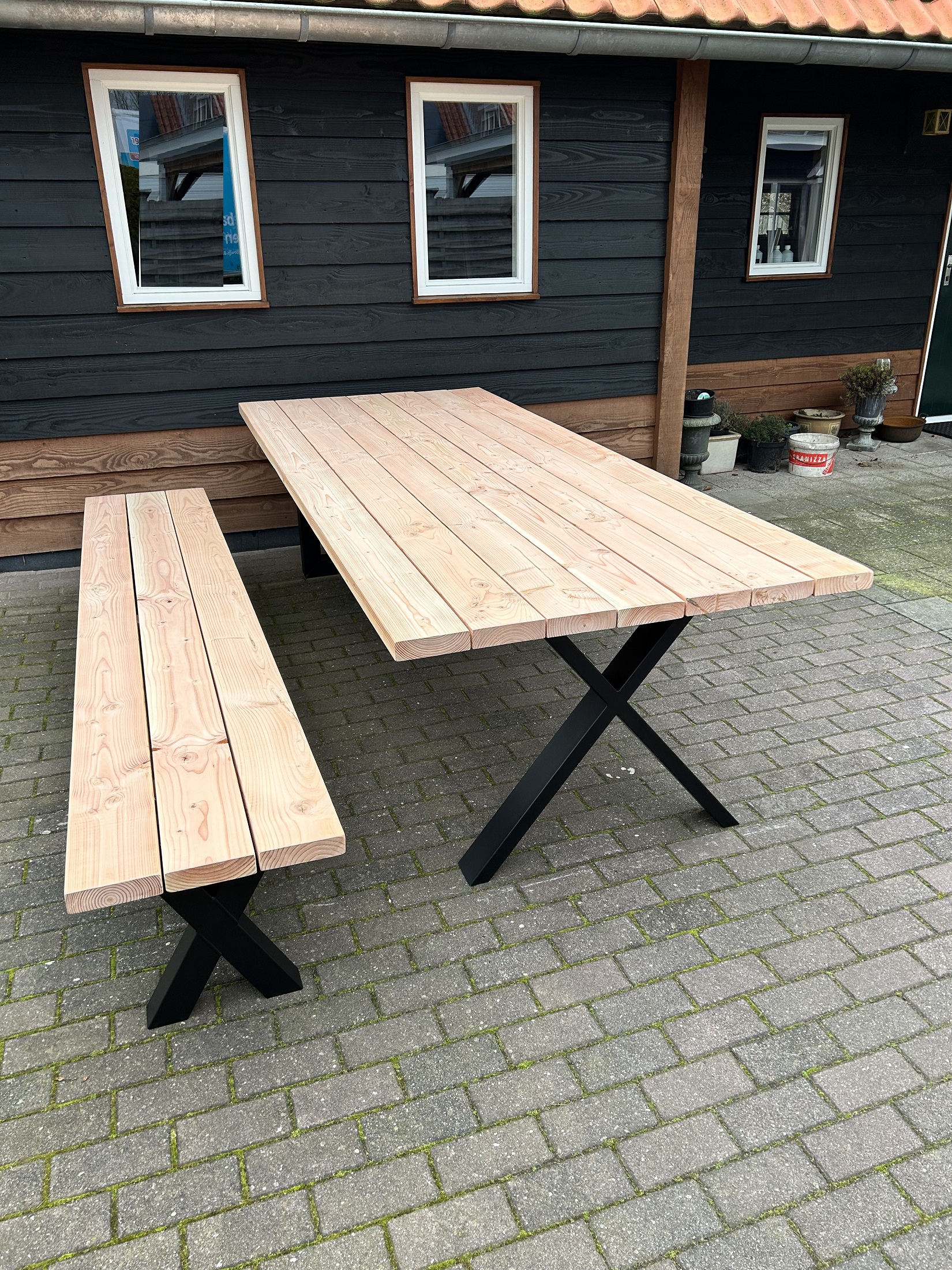 Prachtige Douglas tuintafel met stalen X-fine poot. Het tafelblad is gemaakt van Douglas hout. Doordat wij het gehele proces zelf in de hand hebben garanderen wij de hoogste kwaliteit voor de beste prijs. Het hout wordt vakkundig gedroogd en bewerkt, wij zorgen er altijd voor dat al het hout met een FSC keuring wordt afgegeven. Een Nano coating die wordt aangebracht in combinatie met de kieren a 5-7mm tussen de delen zorgt ervoor dat regenwater er altijd direct afloopt en de tafel dus zo het gehele jaar buiten kan staan! Daarnaast wordt het tafelblad altijd netjes glad afgewerkt en is gemakkelijk met een vochtige doek schoon te maken. De tafelbladen zijn +- 45mm dik massief! De hoogte van de grond af gemeten tot aan bovenkant tafelblad is 77cm. De stalen poten worden compleet gepoedercoat, hierdoor krast het niet als u er met de voet of stoel tegen aan komt. Ook gaat het hierdoor niet roesten, ideaal in gebruik dus!