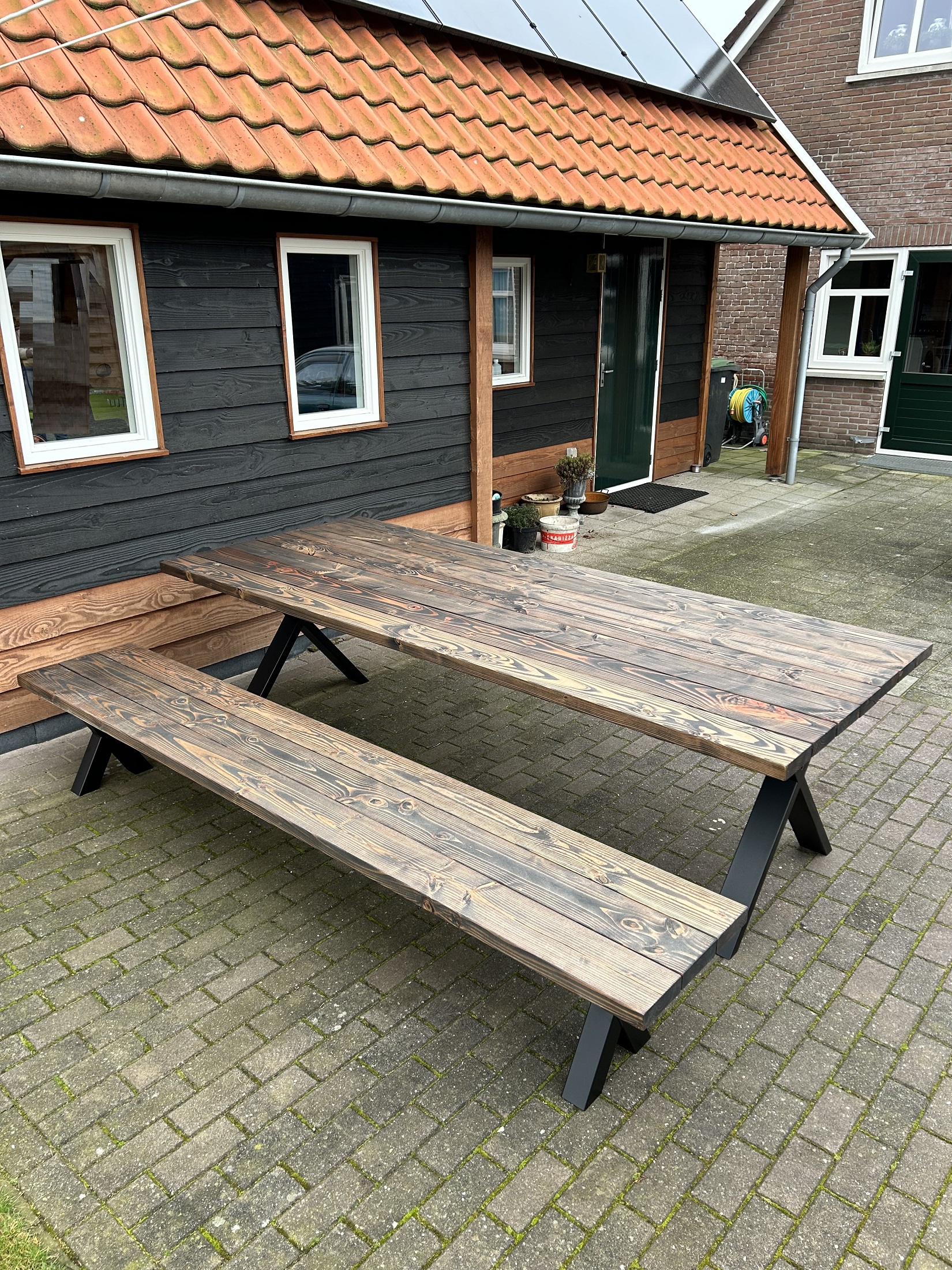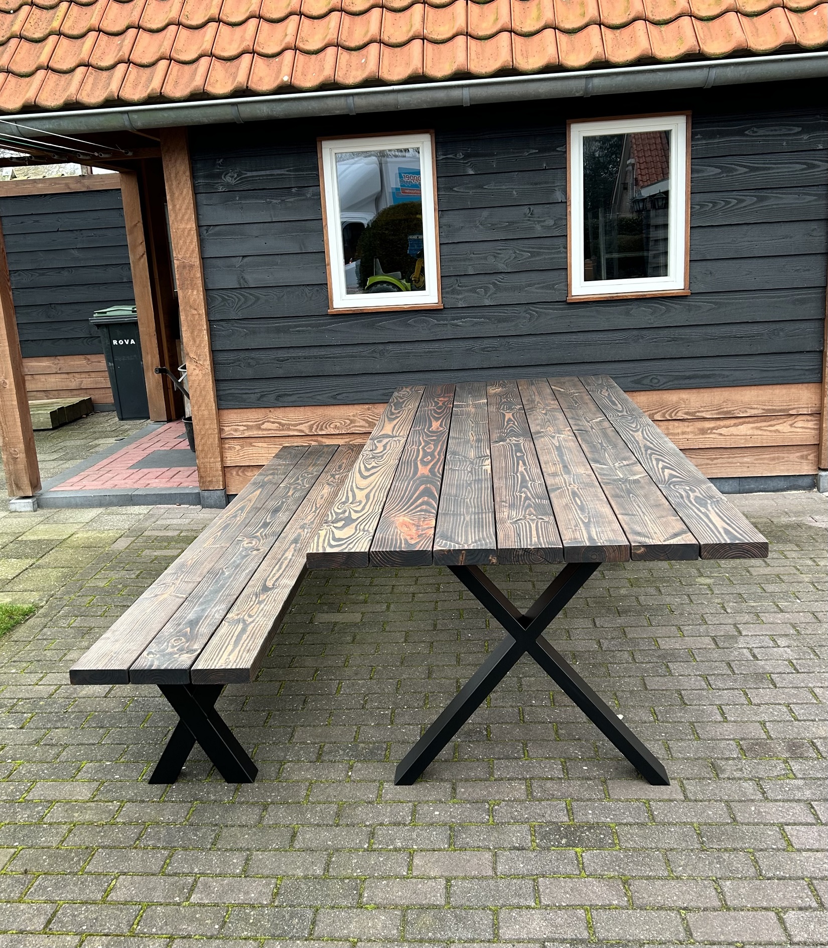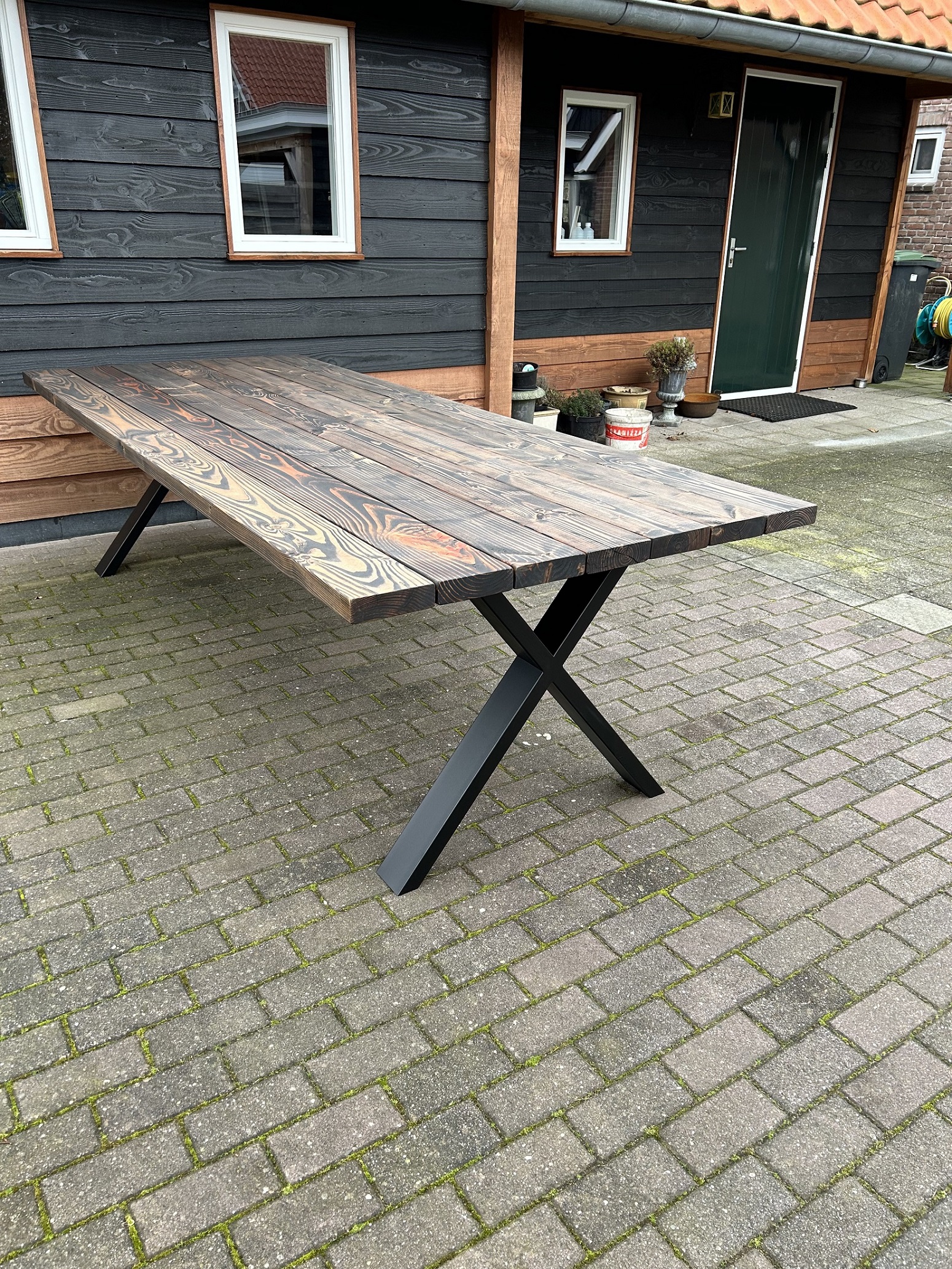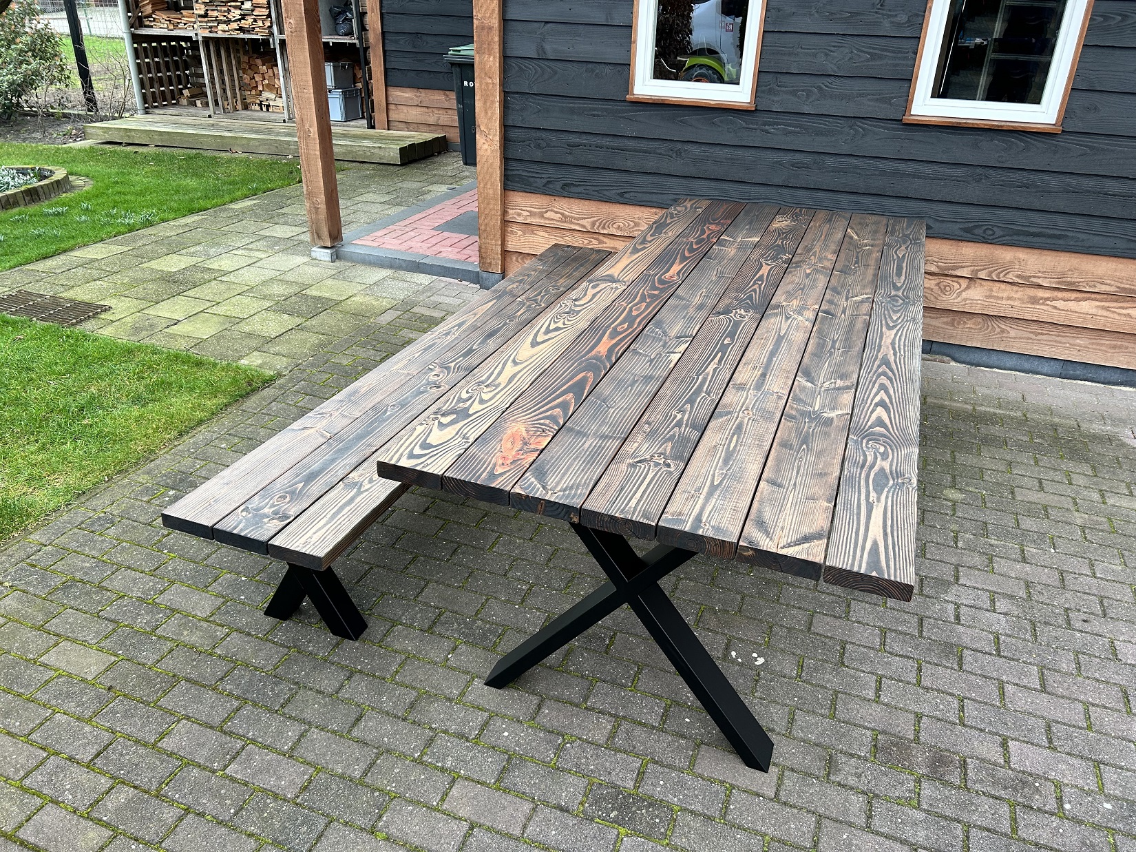 Prachtige Douglas tuintafel met stalen X-fine poot. Het tafelblad is gemaakt van Douglas hout. Doordat wij het gehele proces zelf in de hand hebben garanderen wij de hoogste kwaliteit voor de beste prijs. Het hout wordt vakkundig gedroogd en bewerkt, wij zorgen er altijd voor dat al het hout met een FSC keuring wordt afgegeven. Een Nano coating die wordt aangebracht in combinatie met de kieren a 5-7mm tussen de delen zorgt ervoor dat regenwater er altijd direct afloopt en de tafel dus zo het gehele jaar buiten kan staan! Daarnaast wordt het tafelblad altijd netjes glad afgewerkt en is gemakkelijk met een vochtige doek schoon te maken. De tafelbladen zijn +- 45mm dik massief! De hoogte van de grond af gemeten tot aan bovenkant tafelblad is 77cm. De stalen poten worden compleet gepoedercoat, hierdoor krast het niet als u er met de voet of stoel tegen aan komt. Ook gaat het hierdoor niet roesten, ideaal in gebruik dus!