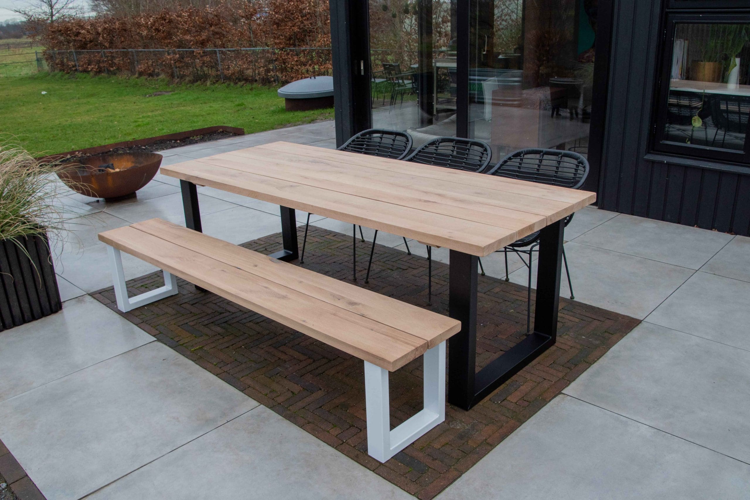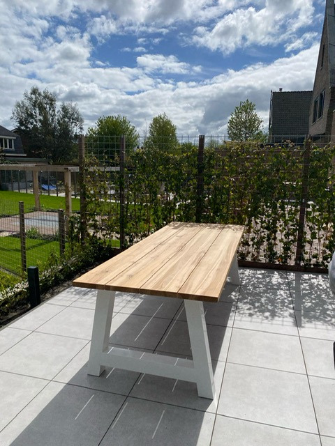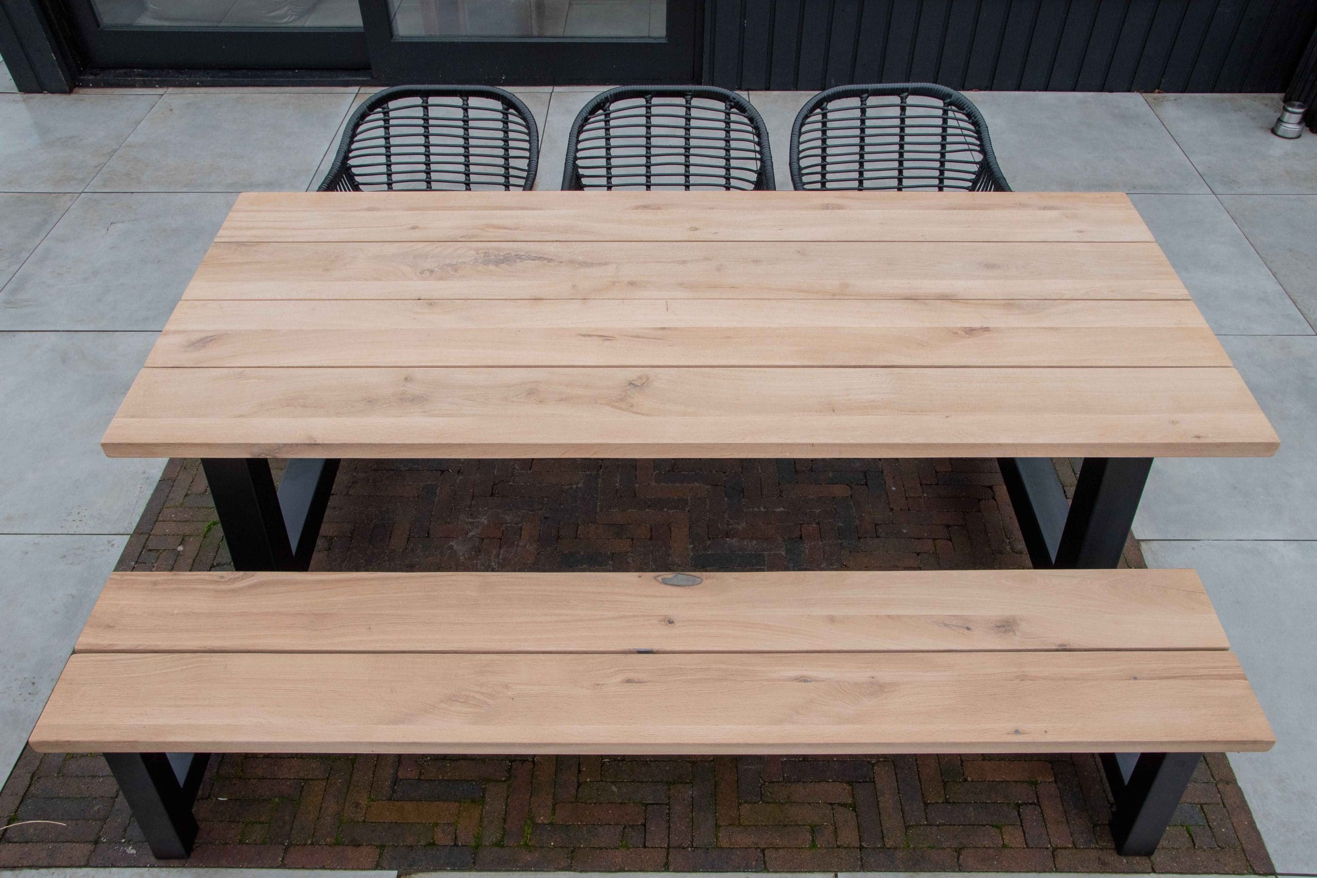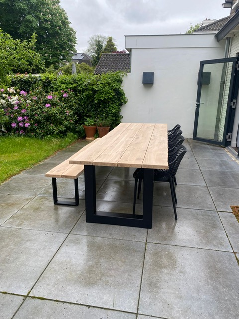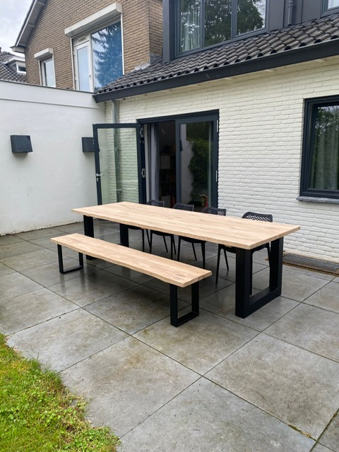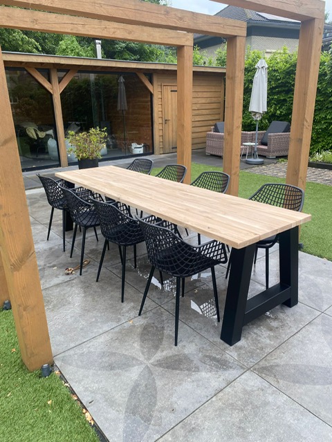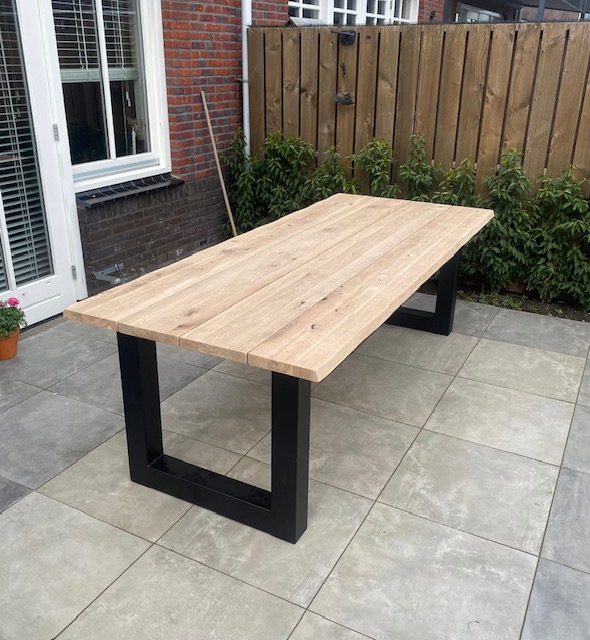 Prachtige tuintafel samenstellen met stalen onderstellen. Het tafelblad is gemaakt van eikenhout afkomstig uit Frankrijk. Doordat wij het gehele proces zelf in de hand hebben garanderen wij de hoogste kwaliteit voor de beste prijs. Het hout wordt vakkundig gedroogd en bewerkt, wij zorgen er altijd voor dat al het hout met een FSC keuring wordt afgegeven. De Nano bescherming zorgt ervoor dat wanneer er scheurtjes ontstaan in het hout het niet gaat rotten en hierdoor niet gaat doorscheuren. In combinatie met de kieren tussen de delen en het zorgvuldig afdekken met een beschermhoes bij het niet gebruiken kan de tafel zo jaren mee! De tafelbladen zijn +- 42mm dik massief! De hoogte van de grond af gemeten tot aan bovenkant tafelblad is +-76,5cm, hoogte vanaf de grond tot aan onderkant blad is +- 72,5cm. De stalen poten worden compleet gepoedercoat, hierdoor krast het niet als u er met de voet of stoel tegen aan komt. Ook gaat het hierdoor niet roesten, ideaal in gebruik dus!