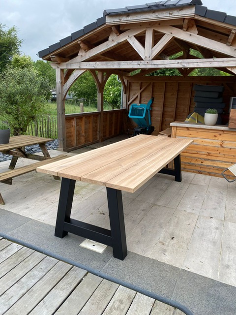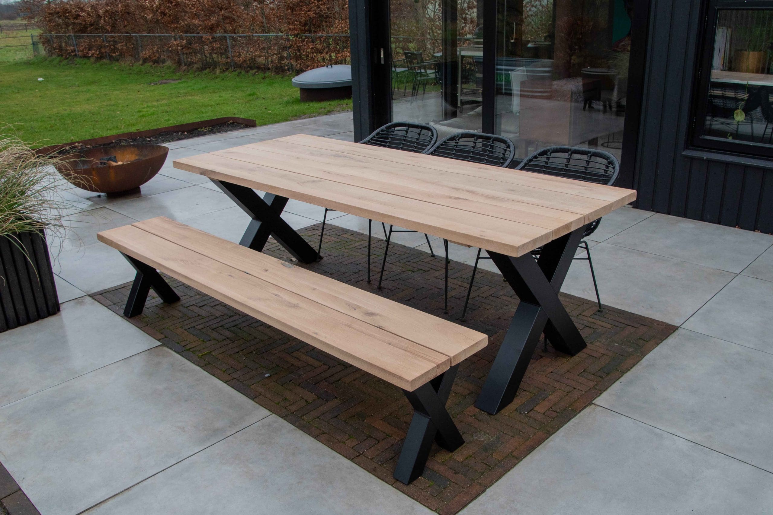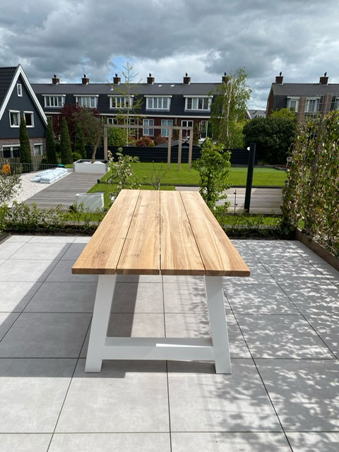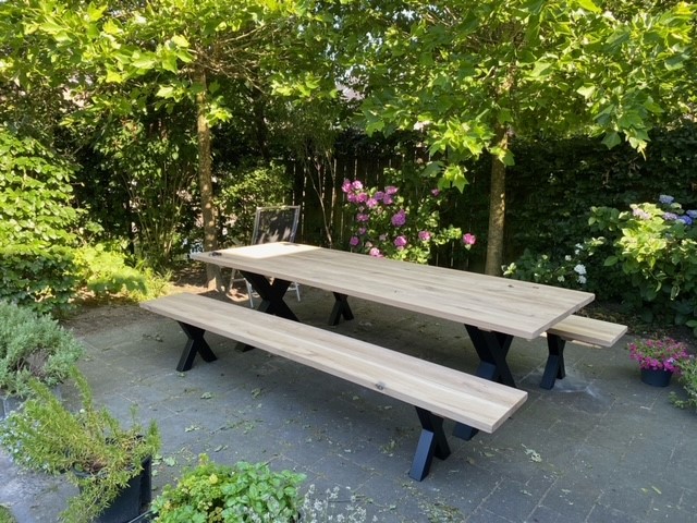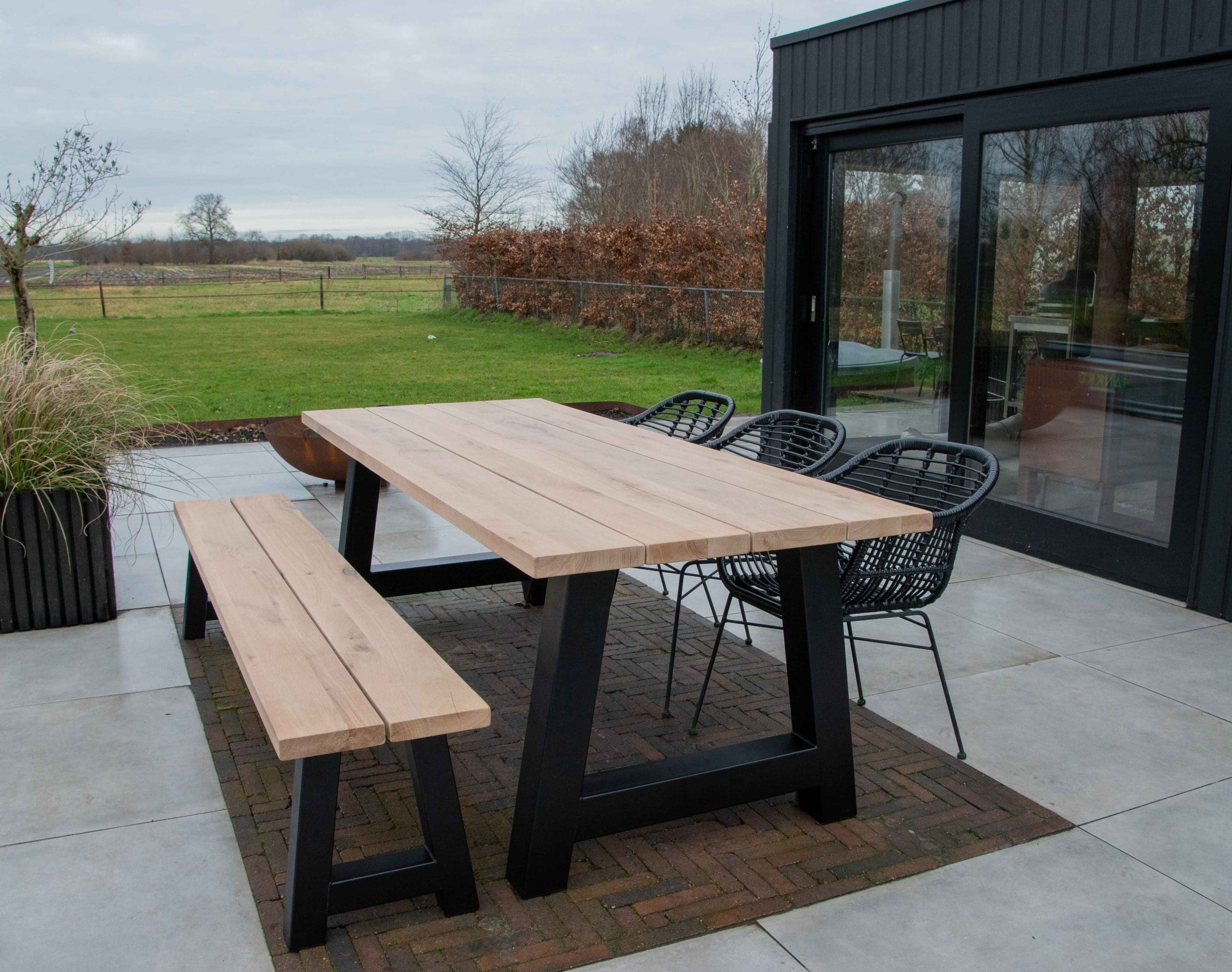 Prachtige tuintafel samenstellen met stalen onderstellen. Het tafelblad is gemaakt van eikenhout afkomstig uit Frankrijk. Doordat wij het gehele proces zelf in de hand hebben garanderen wij de hoogste kwaliteit voor de beste prijs. Het hout wordt vakkundig gedroogd en bewerkt, wij zorgen er altijd voor dat al het hout met een FSC keuring wordt afgegeven. De Nano bescherming zorgt ervoor dat wanneer er scheurtjes ontstaan in het hout het niet gaat rotten en hierdoor niet gaat doorscheuren. In combinatie met de kieren tussen de delen en het zorgvuldig afdekken met een beschermhoes bij het niet gebruiken kan de tafel zo jaren mee! De tafelbladen zijn +- 42mm dik massief! De hoogte van de grond af gemeten tot aan bovenkant tafelblad is +-76,5cm, hoogte vanaf de grond tot aan onderkant blad is +- 72,5cm. De stalen poten worden compleet gepoedercoat, hierdoor krast het niet als u er met de voet of stoel tegen aan komt. Ook gaat het hierdoor niet roesten, ideaal in gebruik dus!