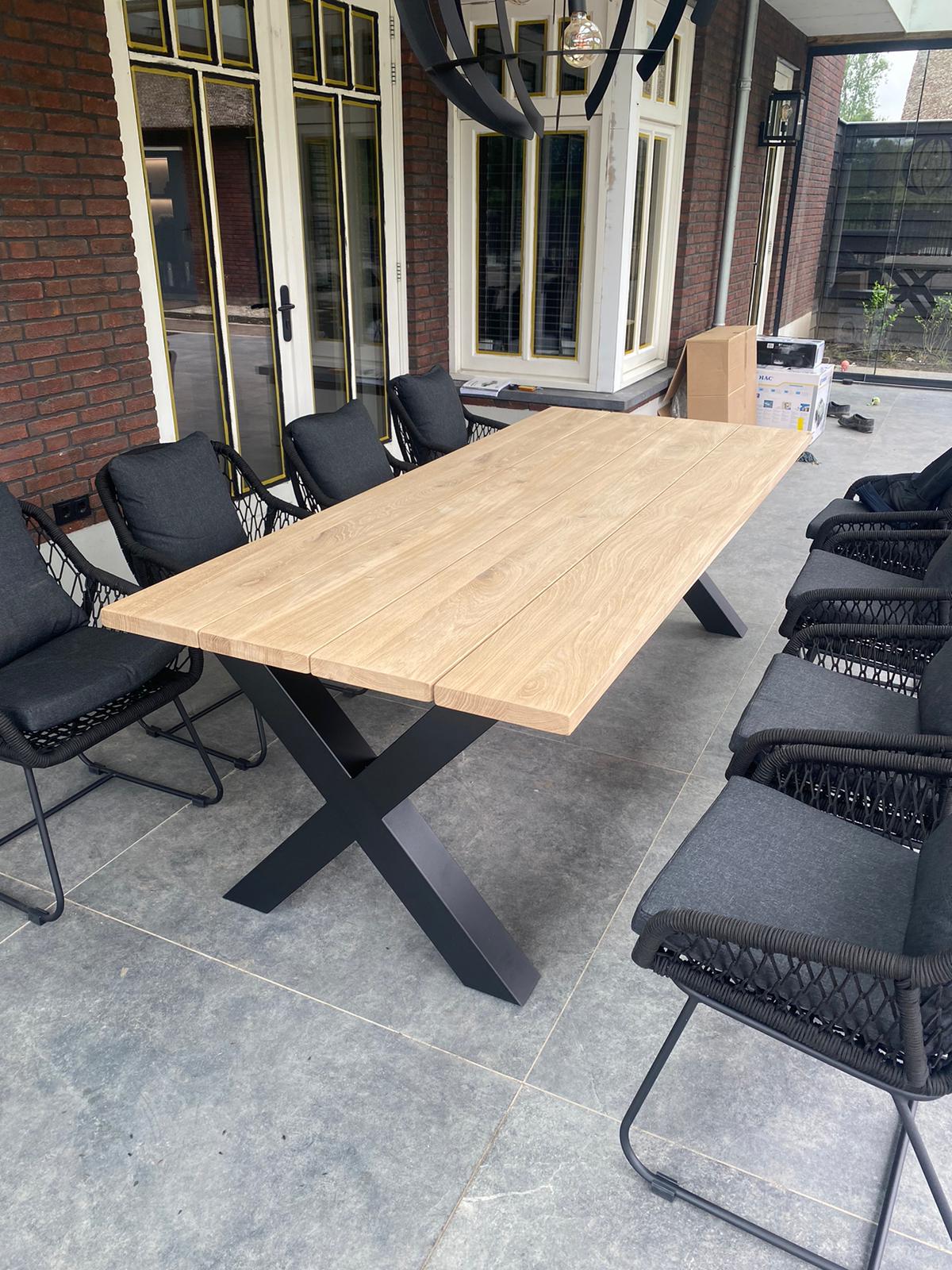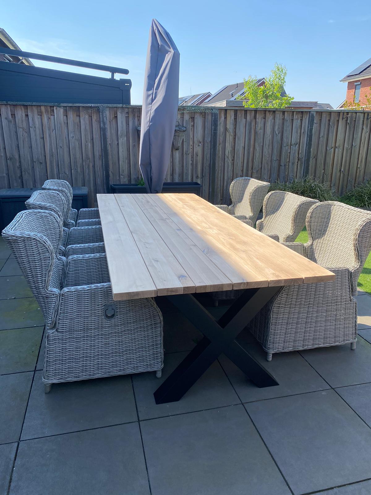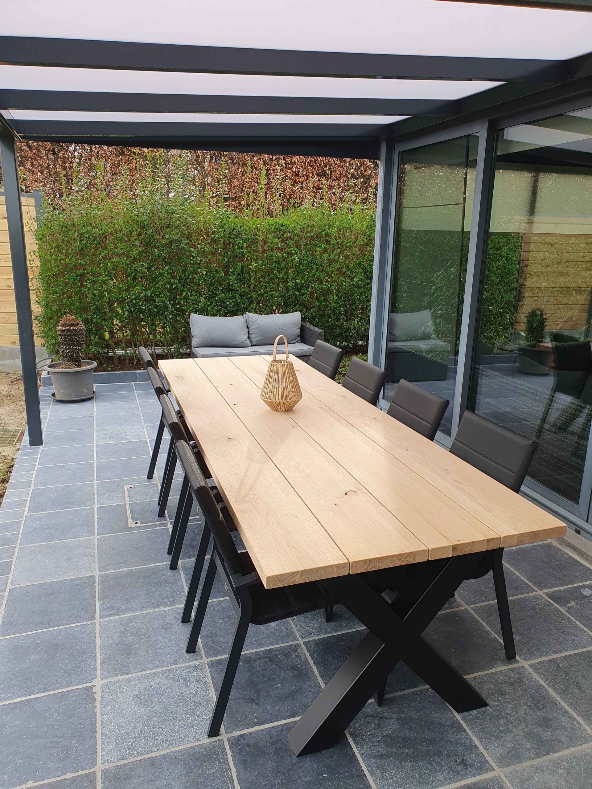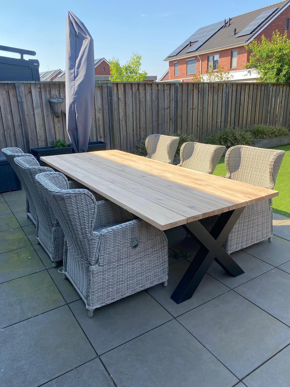 Let wel op eikenhout werkt buiten altijd, het hout zal altijd vergrijzen en er zullen haarlijnen en scheuren ontstaan. Wij raden altijd een bij het niet gebruiken ervan de tafel volledig af te dekken met een beschermhoes. De beschermhoes is direct mee te bestellen bij de tafel, hierdoor zult u de levensduur flink verlengen!